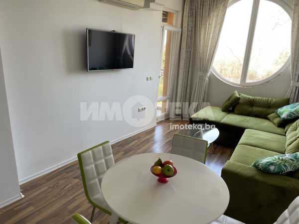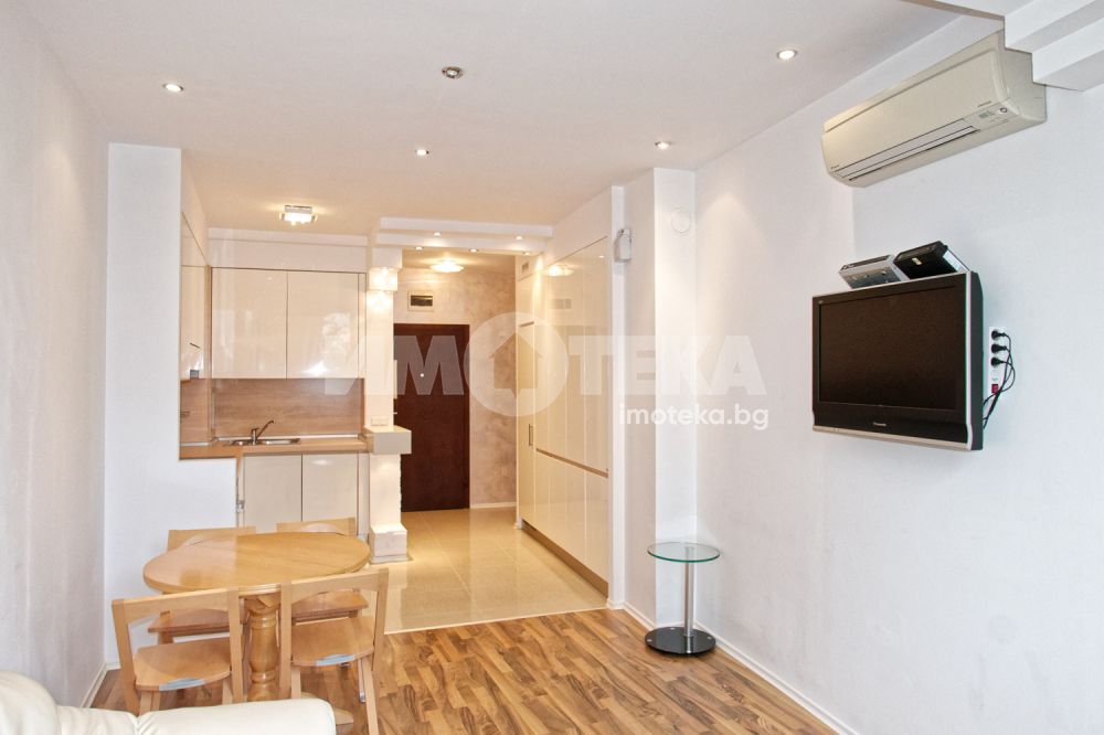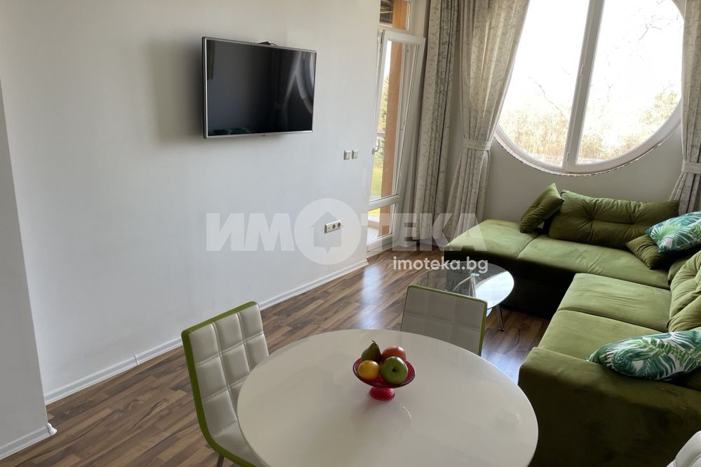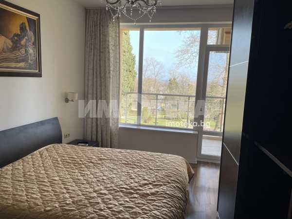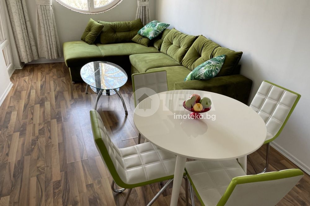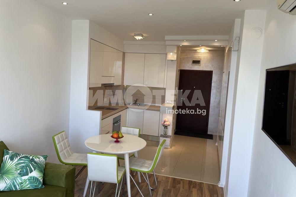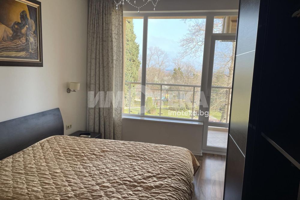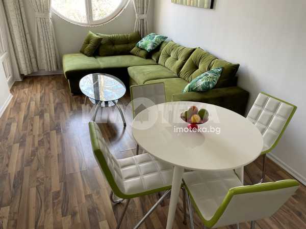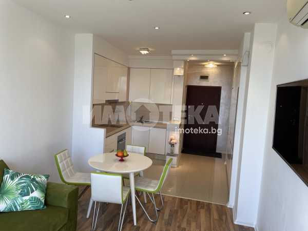 Двустаен, елегантно обзаведен апартамент в сърцето на Морската градина. Жилището се намира в затворен комплекс, с видео наблюдение, много зелени площи, алеи за разходка. Състои се от дневна с модерна кухня, напълно оборудвана (включително и съдомиялна), комфортна спалня с много гардероби, баня/тоалет заедно, отделно втори тоалет, широко входно антре. Наемателите ползват паркомясто в комплекса. Допълнително се заплаща 50Е/месечно такса обслужване на комплекса.
