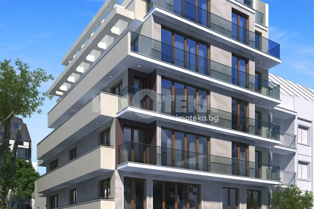 Апартаментът е ситуиран на шести етаж, общата площ е 127.11 кв. м., функционално разпределена в дневна - 26.73 кв.м, две спални, баня с тоалет, тоалет ,коридор, голям балкон.
