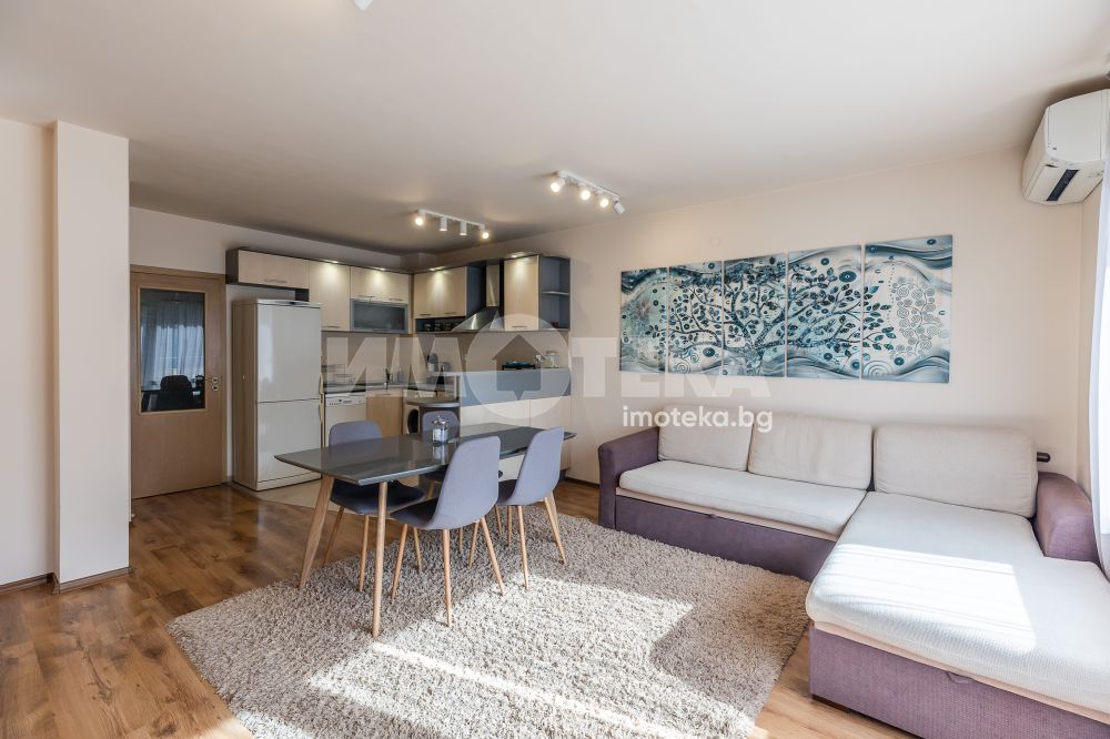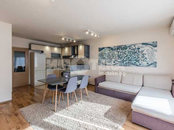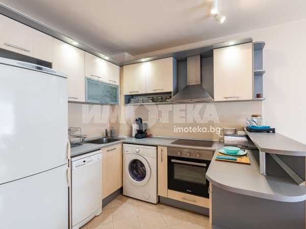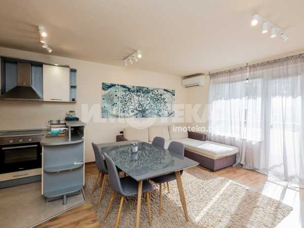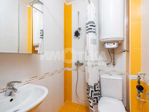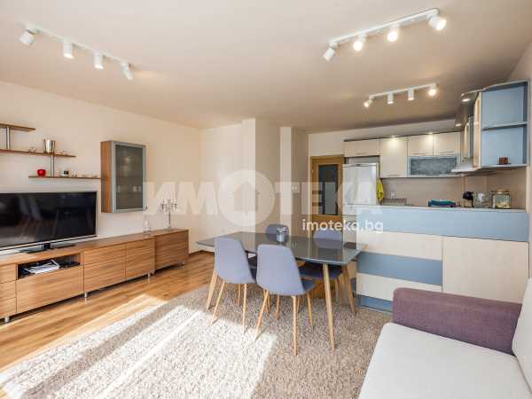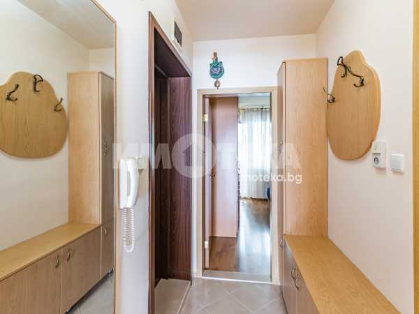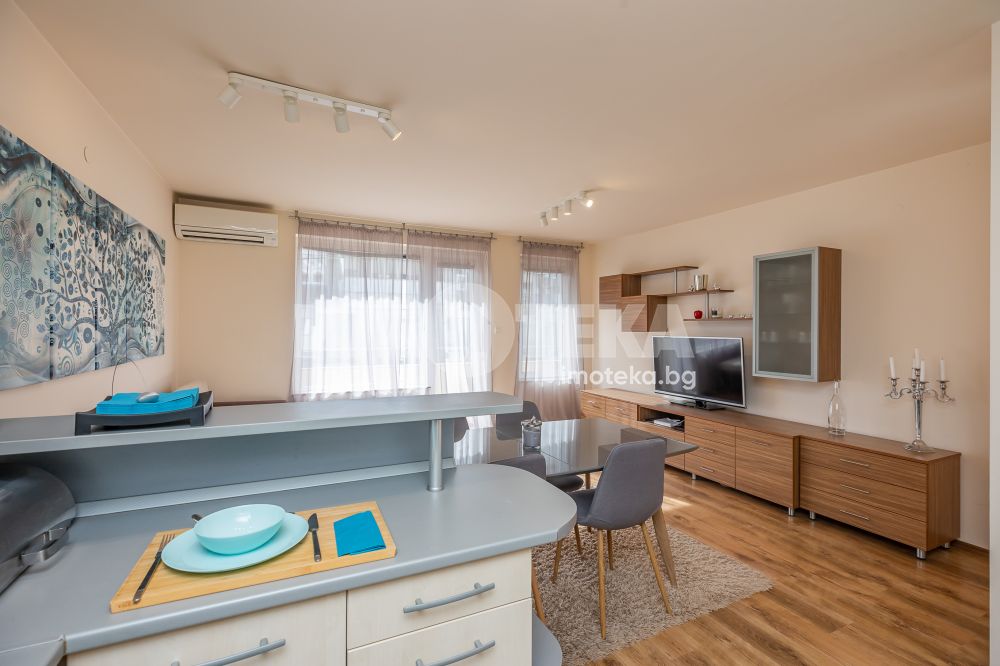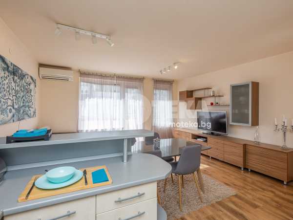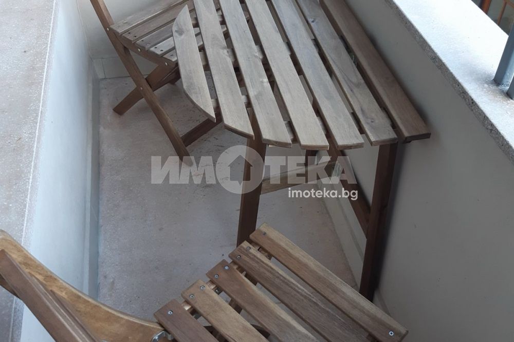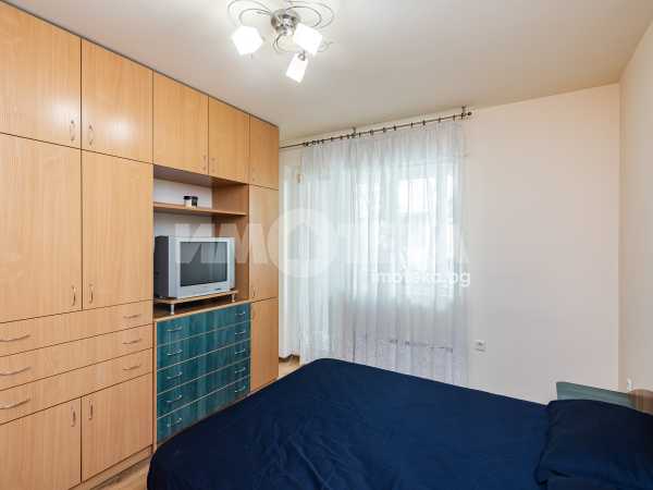 Двустаен отлично обзаведен апартаментнв района на Окръжна болница. Състои се от входно антре, дневна с мека мебел, напълно оборудван кухненски бокс /печка, пералня, хладилник и съдомиялна/, маса за хранене; спалня с легло спалня и гардероби, две тераси - остъклена към спалнята и открита към дневната. Отоплението е с климатик в дневната и конвектор в спалнята.