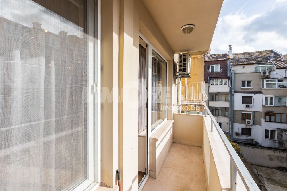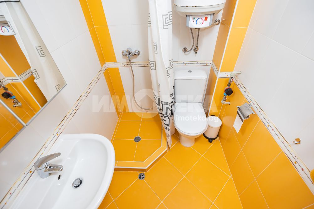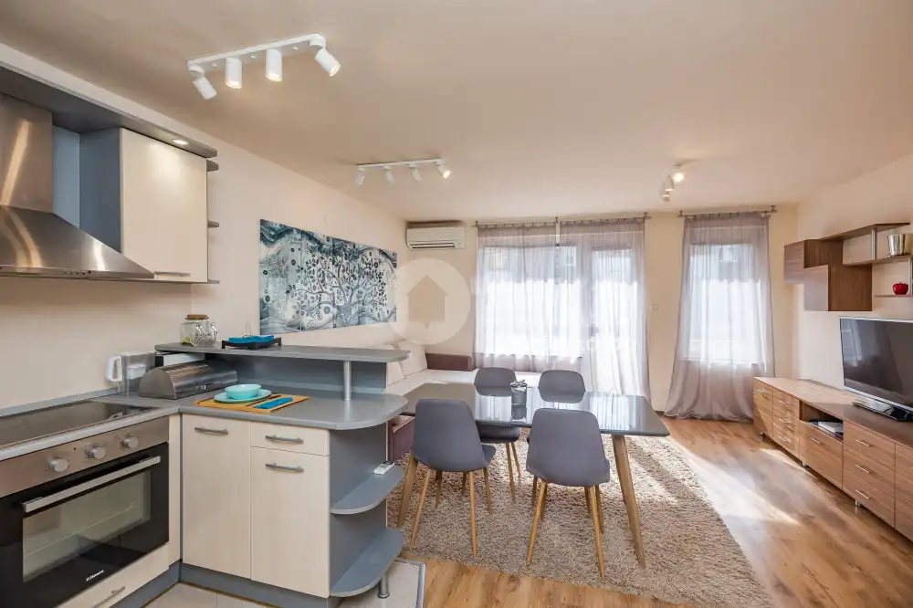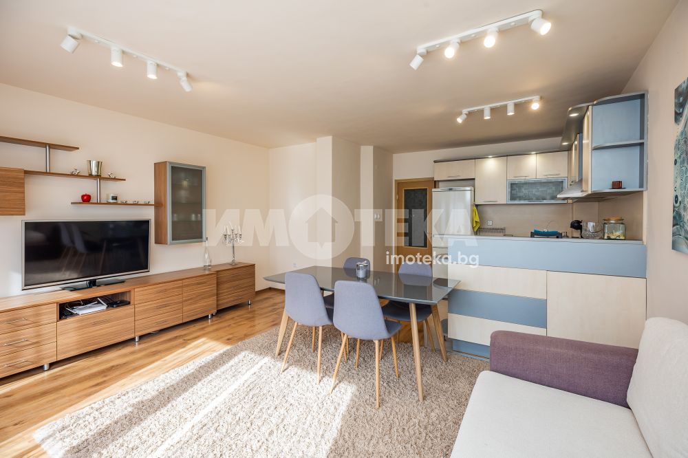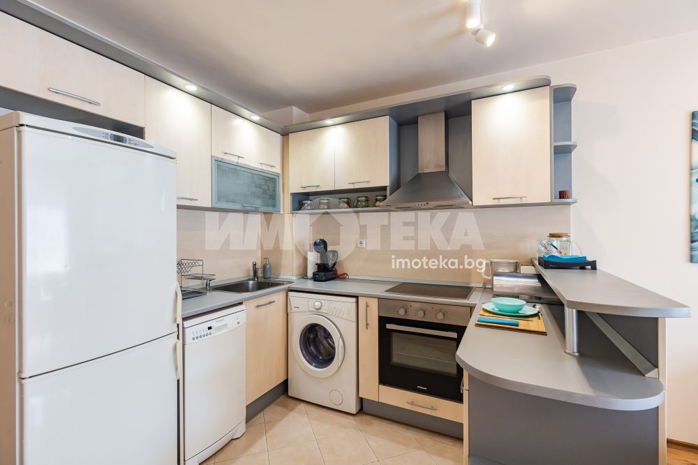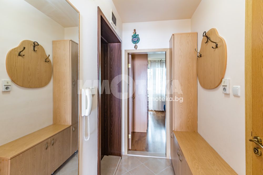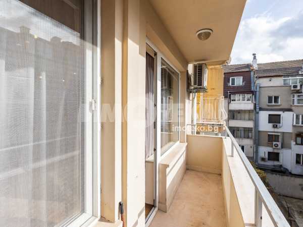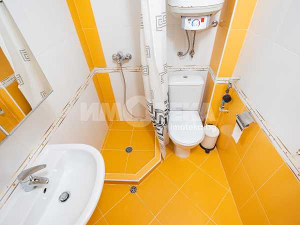 Двустаен отлично обзаведен апартаментнв района на Окръжна болница. Състои се от входно антре, дневна с мека мебел, напълно оборудван кухненски бокс /печка, пералня, хладилник и съдомиялна/, маса за хранене; спалня с легло спалня и гардероби, две тераси - остъклена към спалнята и открита към дневната. Отоплението е с климатик в дневната и конвектор в спалнята.