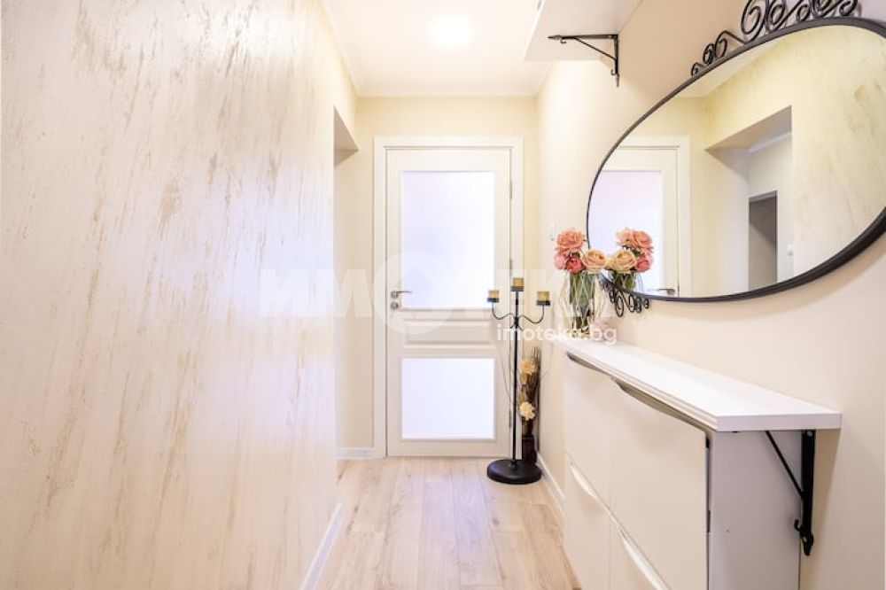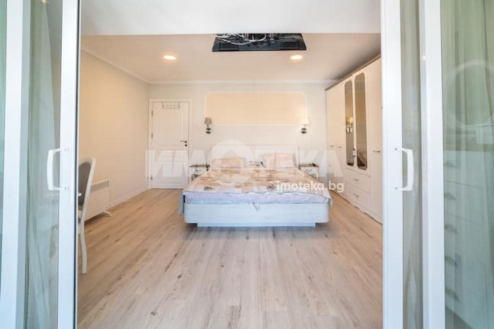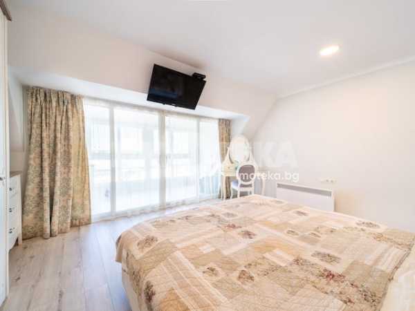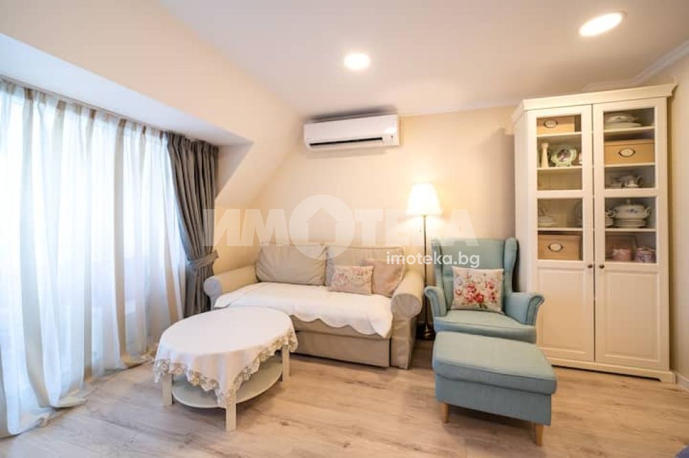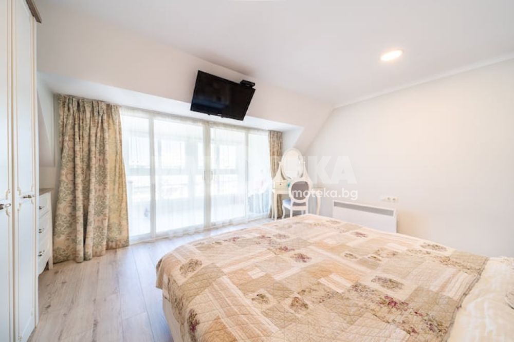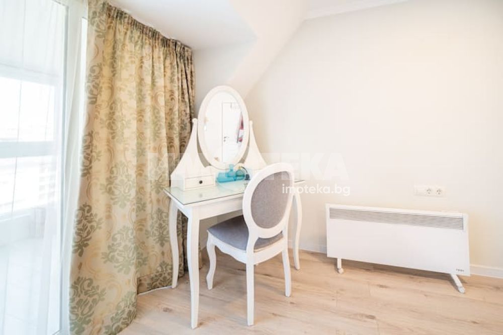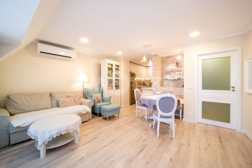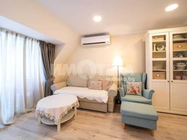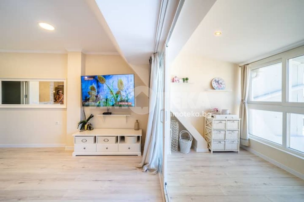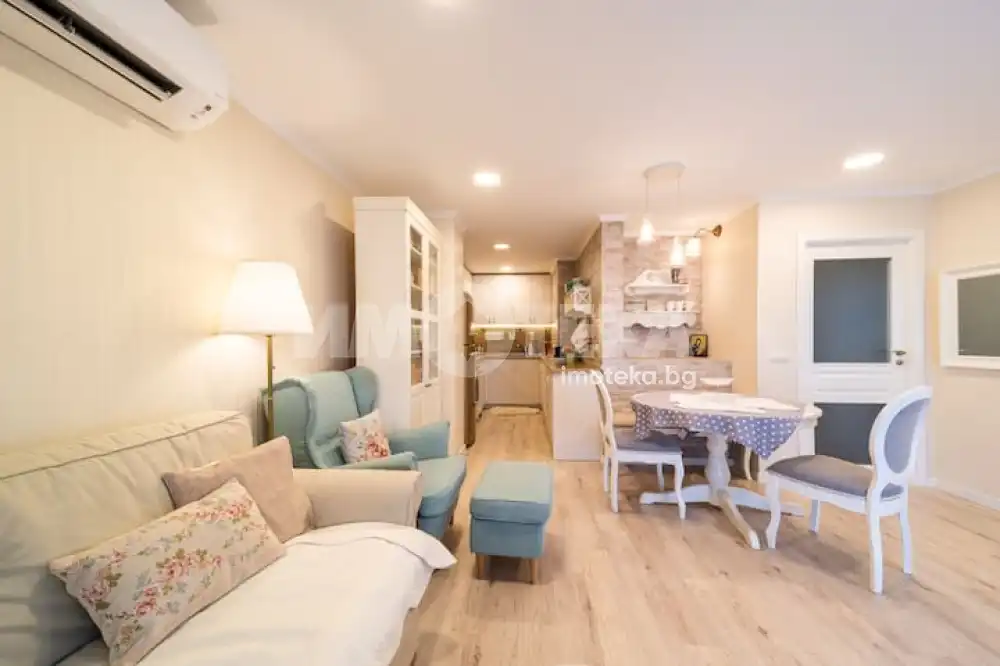 Дизайнерски обзаведен двустаен апартамент,изключително елегантен и стилен.Състои се от просторна слънчева дневна с мека мебел,маса за хранене,отделен кухненски кът с модерна вградена кухняоборудвана с бяла техника,вкл.съдомиялна машина;голяма закрита тераса към дневната;спалня с легло-спалня,гардероб;закрита тераса къмспалнята;баня,тоалет,перално помещение/пералня,сушилня/.