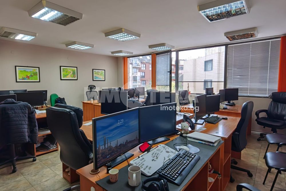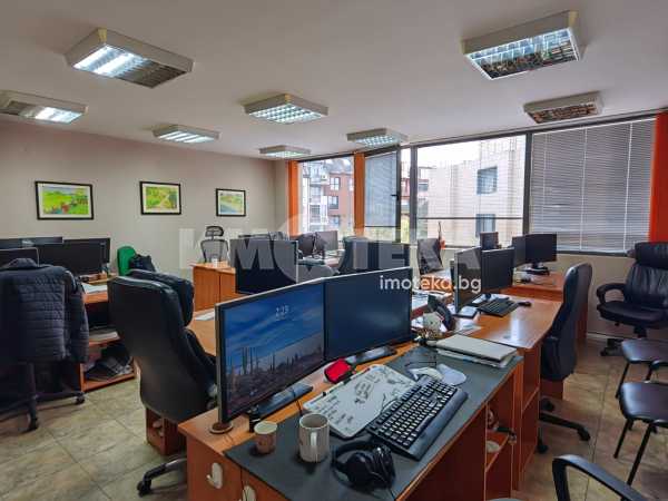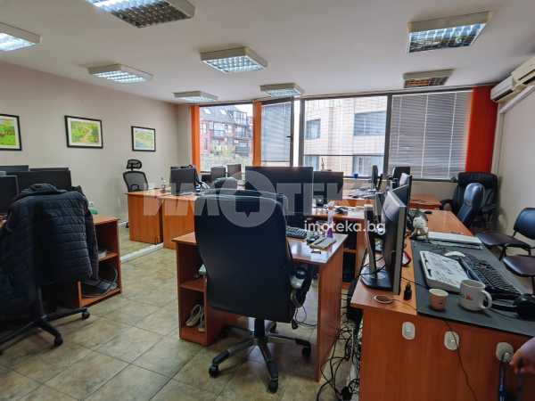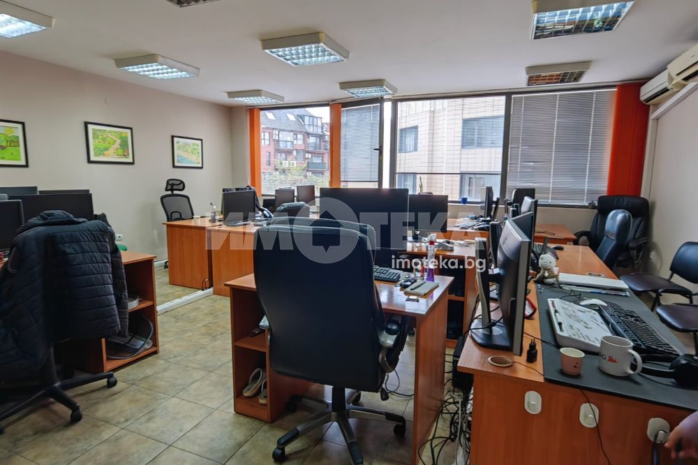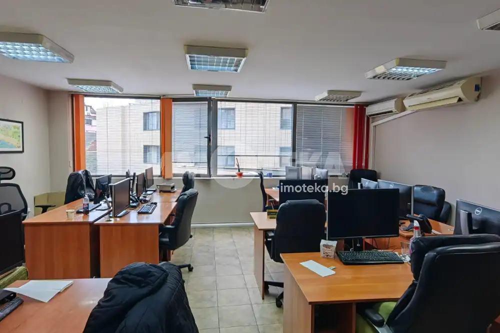 Офисът е разположен на 3-ти етаж в сграда с модерна фасада, с денонощна охрана. Състои се от едно общо помещение със собствен санитарен възел. Отопление/охлаждане с климатик. Асансьор и ограничен достъп до етажа.