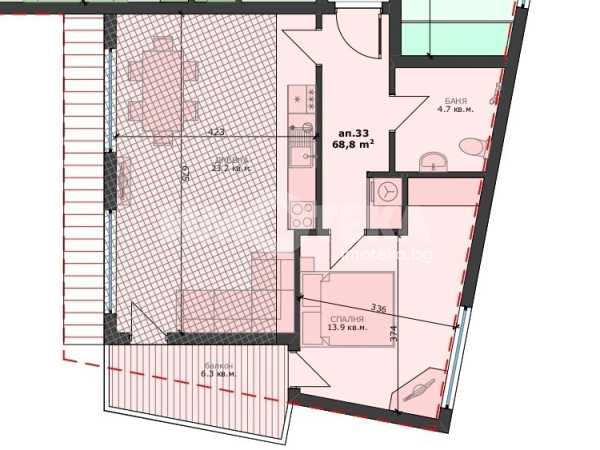 Просторна дневна с кухненски част и излаз на голяма южна тераса.