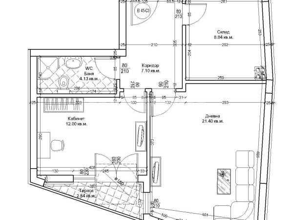 Намира се на висок първи етаж с изложение на югозапад към Варненското езеро. Имотът има следното разпределение: дневен тракт с кухня, една спалня с тераса, голяма тъмна стая /втора спалня/, баня тоалетна, коридор. Имота е завършен до ключ с подови настилки, шпакловани и боядисани стени с декоративна модерна италианска мазилка стени, завършена баня с тоалетна /необорудвана/.