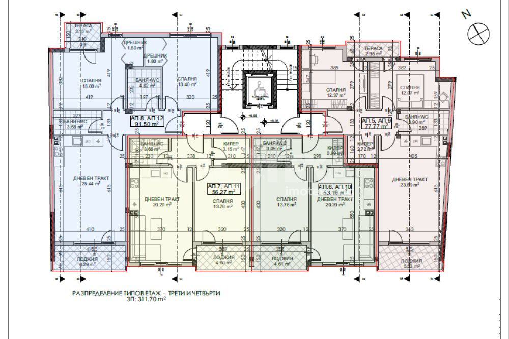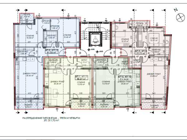 Тристаен апартамент, състоящ се от дневен тракт, две спални, баня и тоалет, коридар, две тераси.