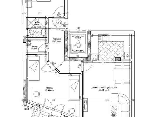 Апартаментът е на среден втори етаж /над жилищен етаж/ и се състои от дневен тракт и спалня с тераса към Варненското езеро, втора спалня, баня с тоалетна, втора тоалетна и коридор. Апартаментът е с монтирани врати, подови настилки, шпакловани и боядисани с красива декоративна италианска мазилка стени.