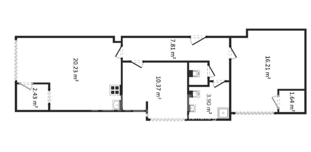 тракт и кухненска част, две спални (16 и 10 кв.м.), напълно оборудвана баня, отделно тоалет и два уютни балкона съответно към дневната и родителската спалня.