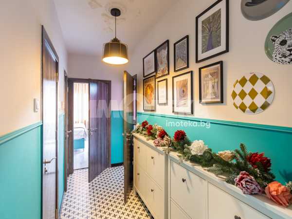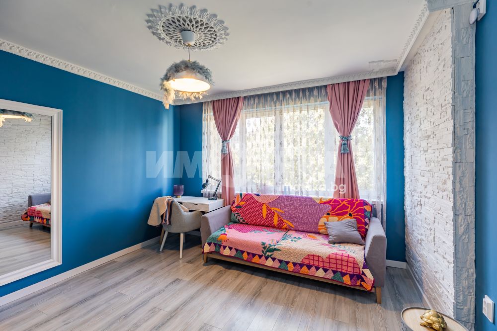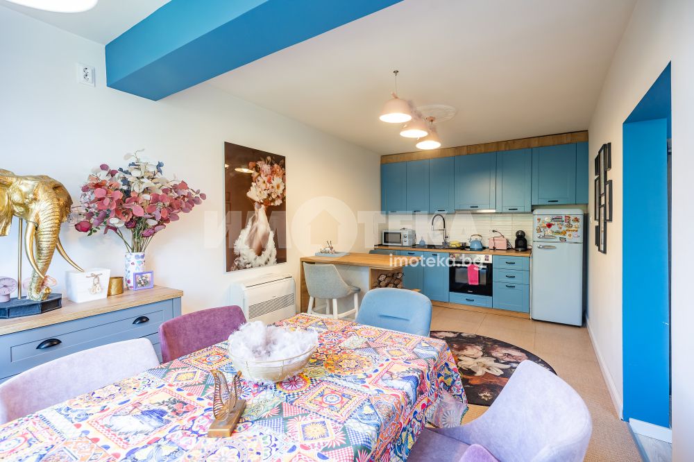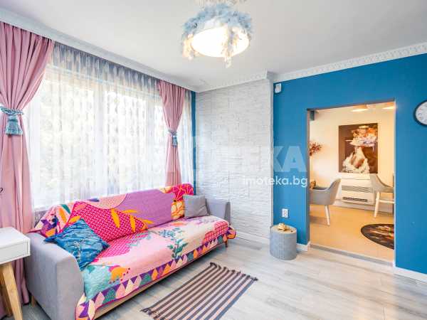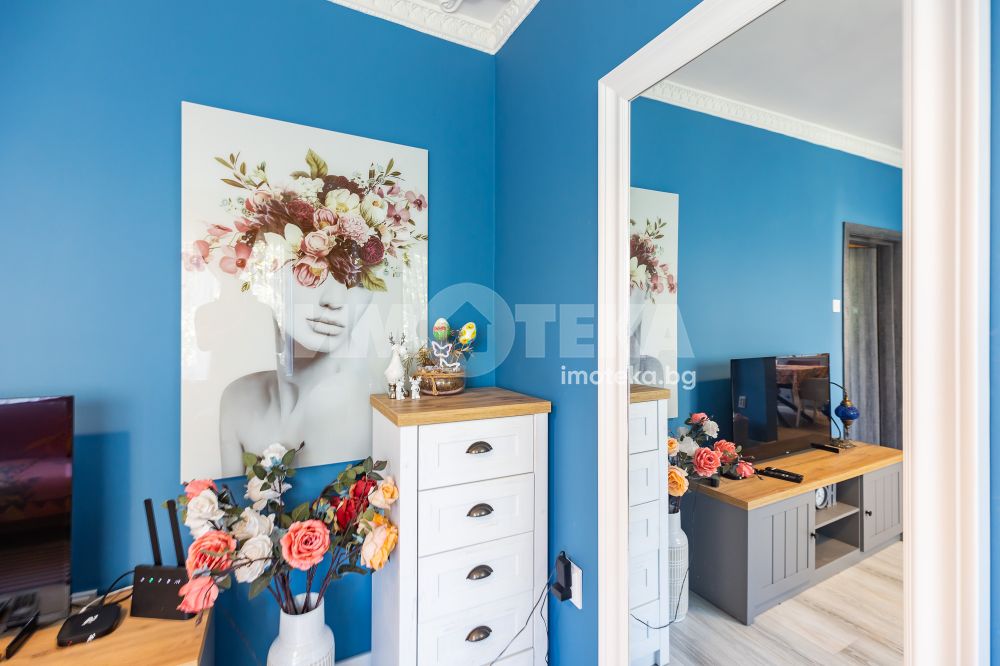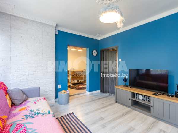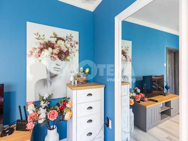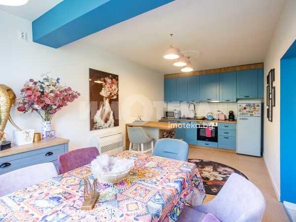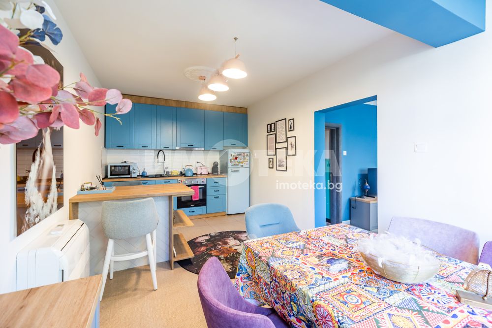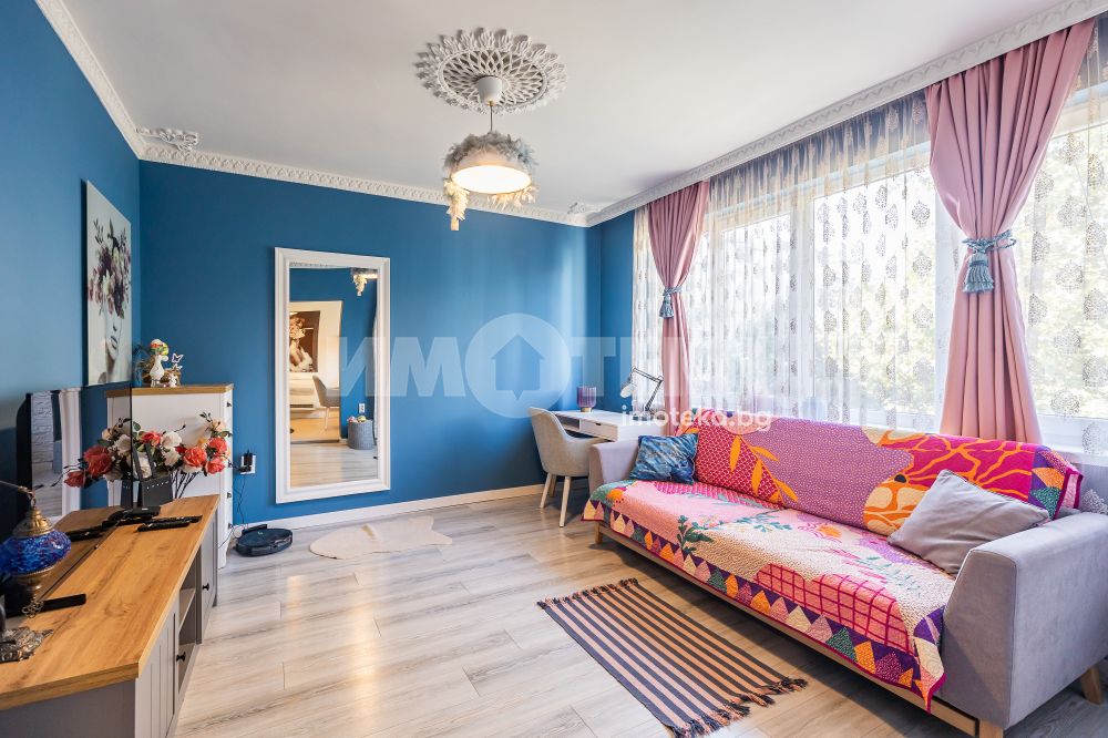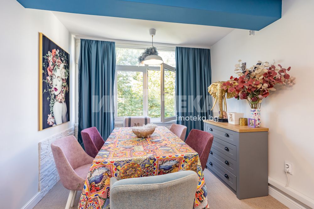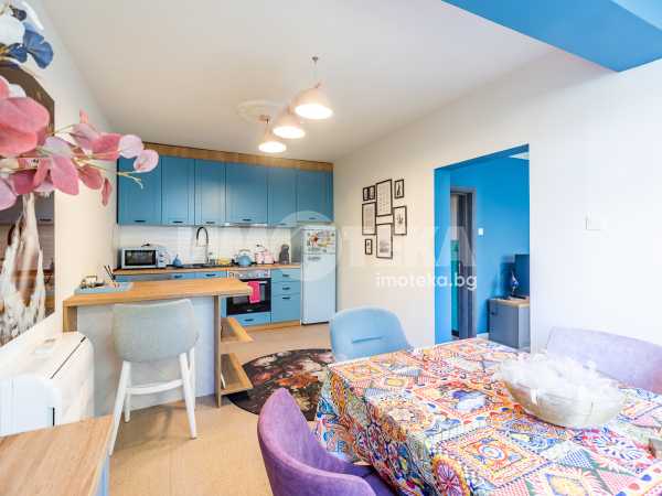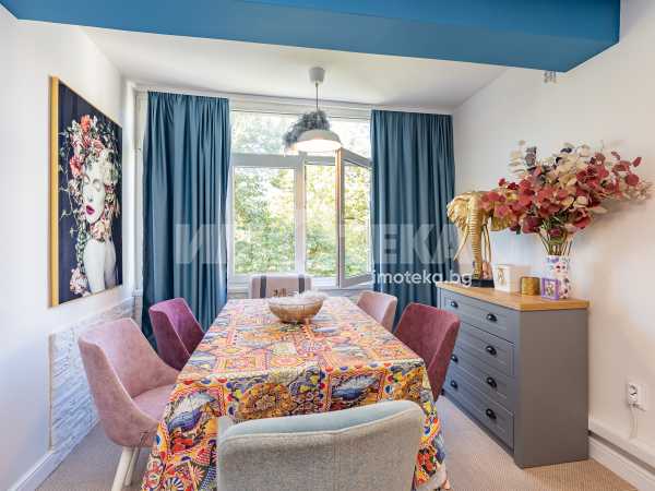 Представяме Ви четиристаен апартамент след основен ремонт, превърнат в уютен и стилен дом с внимание към всеки детайл. Жилището се предлага напълно обзаведено с качествени мебели и техника – готово за нанасяне без необходимост от каквито и да е допълнителни инвестиции.Разпределението е функционално и удобно: входно антре с отделено перално помещение, просторен хол, отделна кухня с трапезария, две спални с излаз към обща тераса, баня и отделна тоалетна.