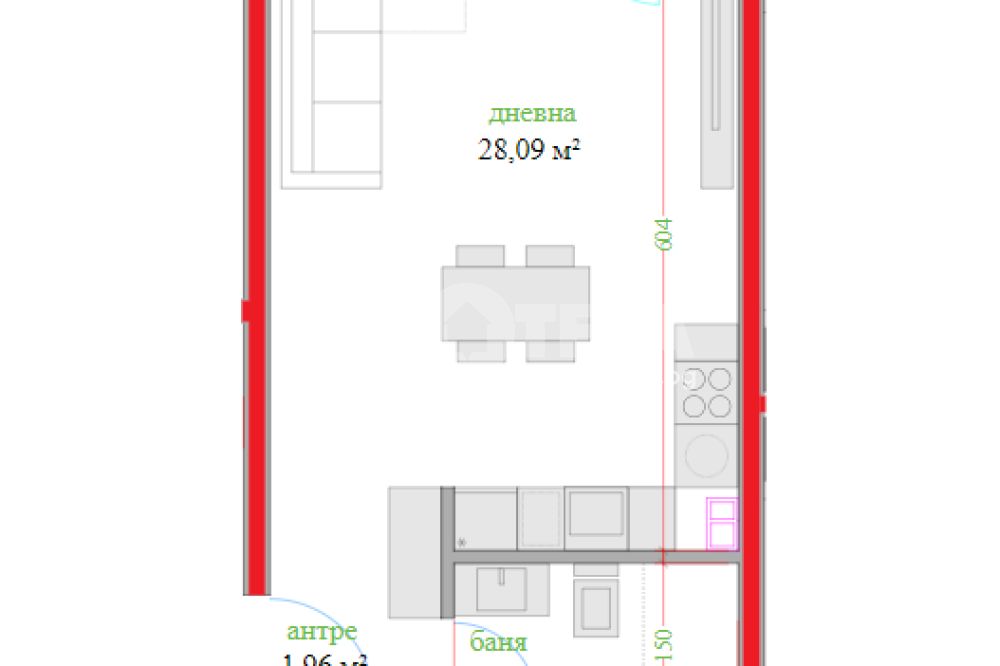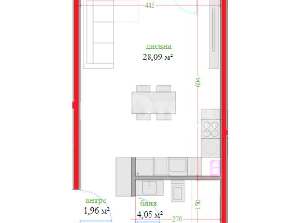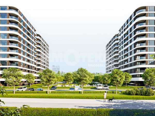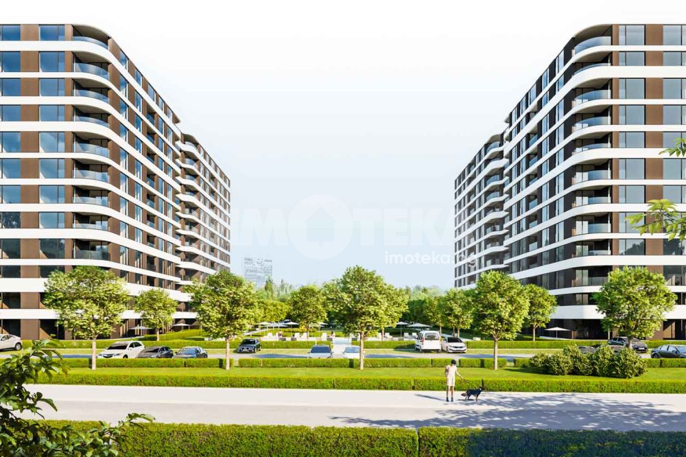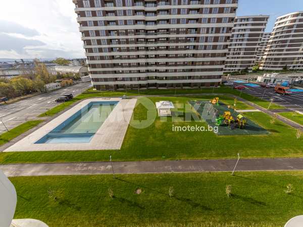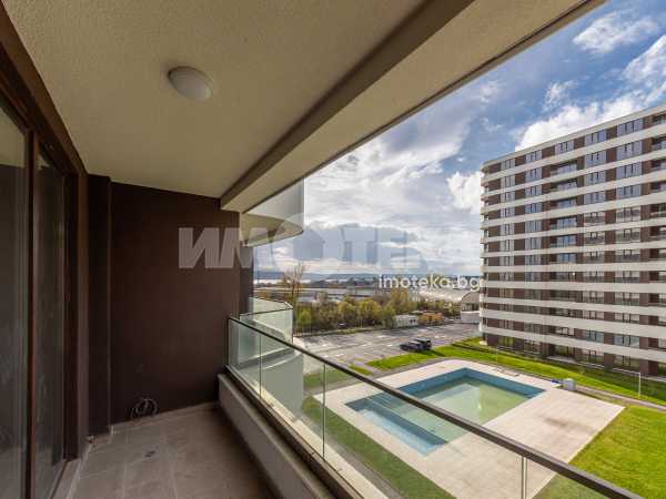 Спалня с изложение Изток, всекидневна на Запад с площ 28 кв.метра и широка лоджия пред нея с гледка към парка и басейна на Комплекса.