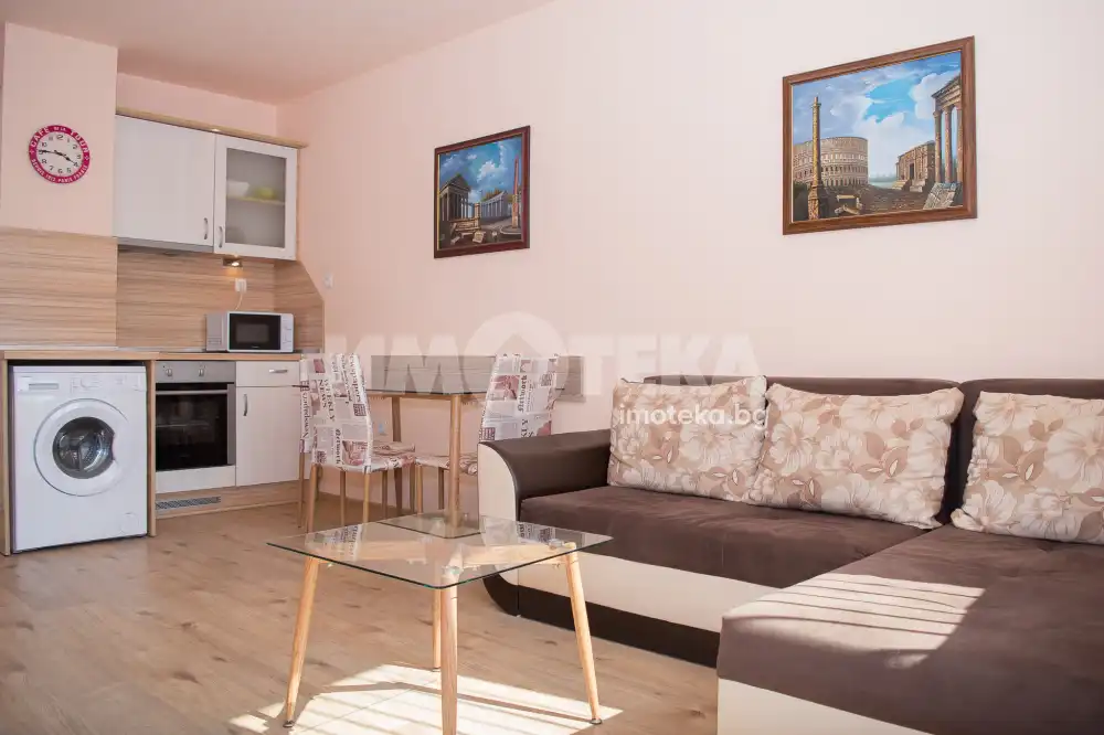 Двустаен, южен апартамент, напълно обзаведен със всичко, дори и с прибори. Жилището е в отлично състояние, отоплява се с два климатика. Отдава се дългосрочно