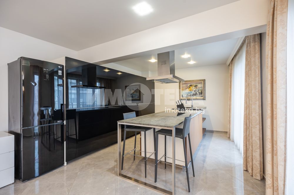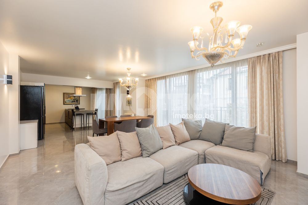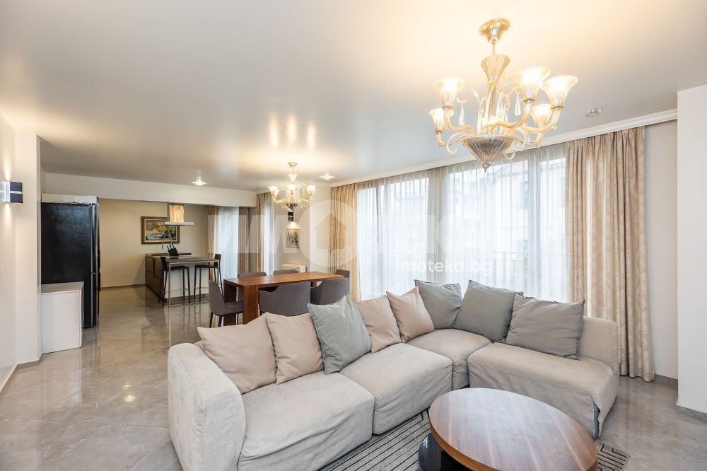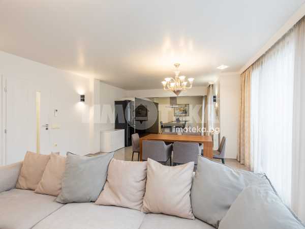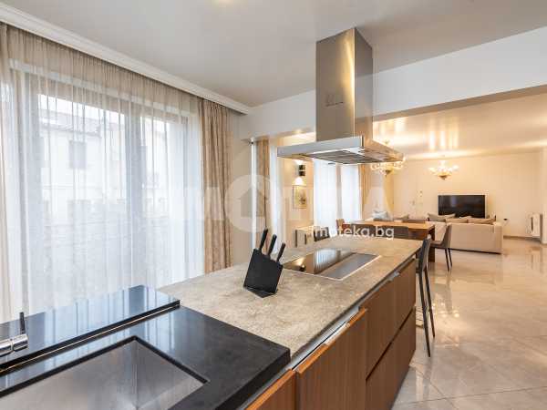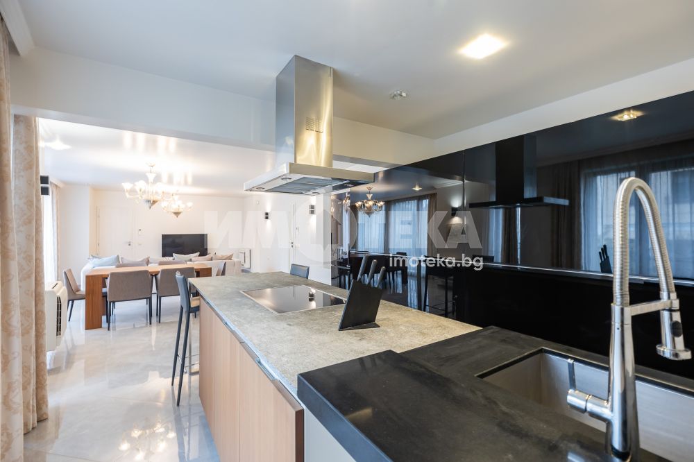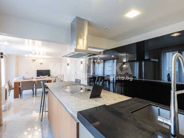 Стилен луксозен апартамент обзаведен с италиански мебели от Мартинели..Просторна всекидневна с кухненски остров,място за съхранение на посуда и консумативи.Три спални с три бани,с възможност третата да бъде обзаведена по предпочитание на клиента,като детска или офис.Гардеробно,перално с бойлер 250 л. вместимост.