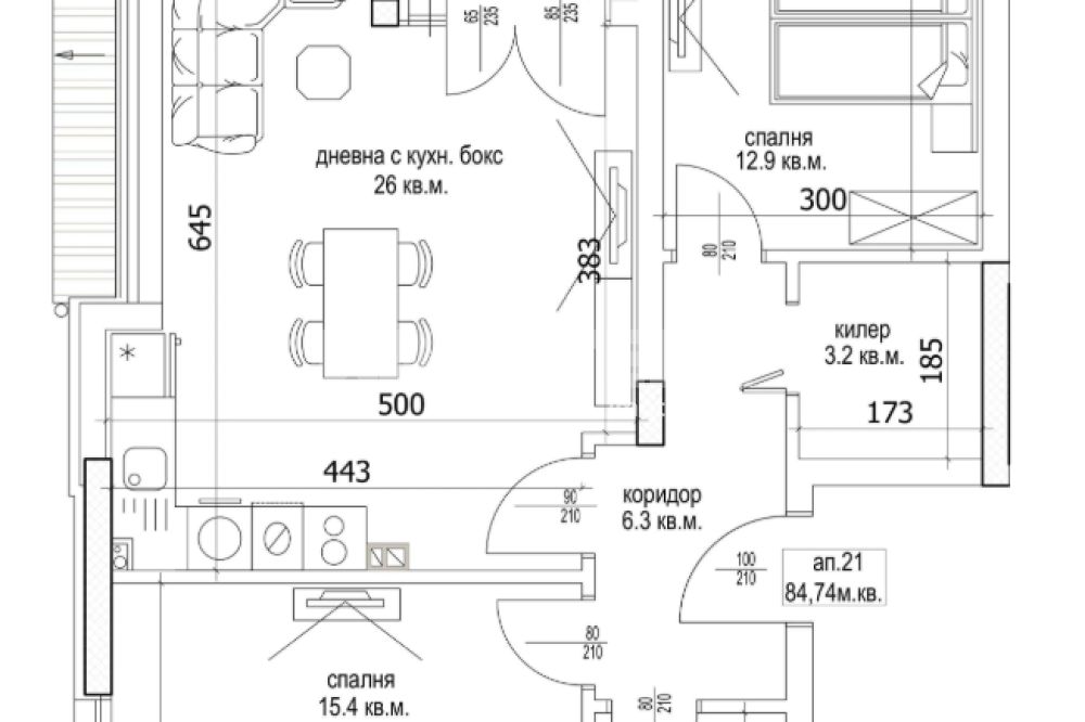 В продажба е тристаен апартамент в новострояща се сграда. Имота се състои от дневен тракт 26 кв.м, две спални по 13 и 15,4 кв.м, баня с тоалетна, голям килер и коридор, една тераса тип лоджия.