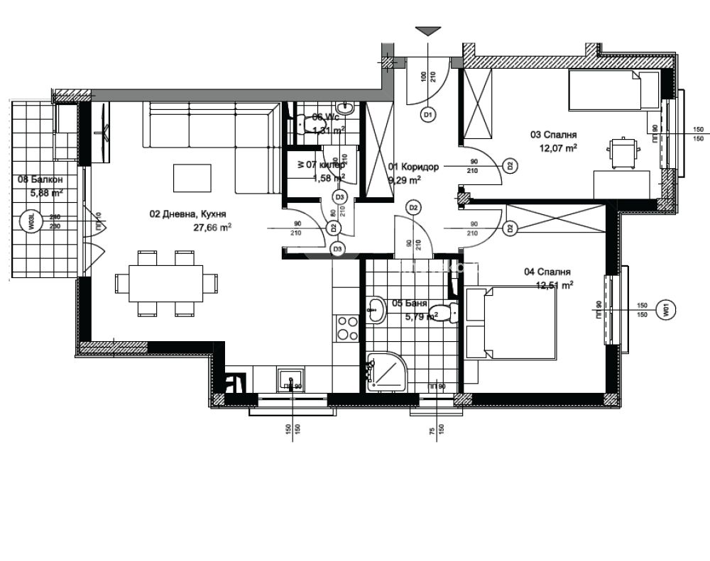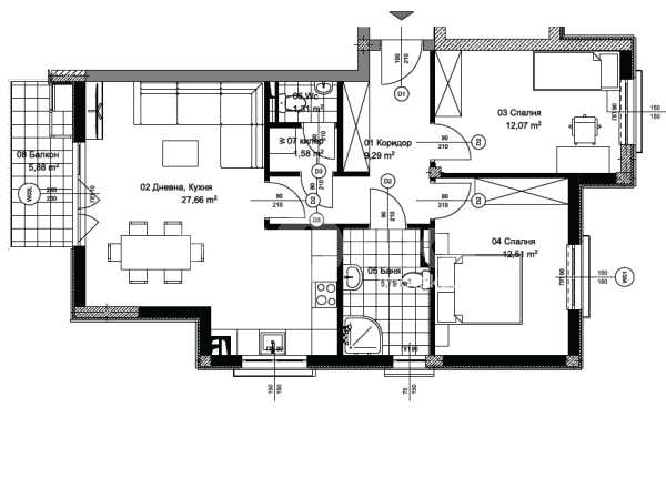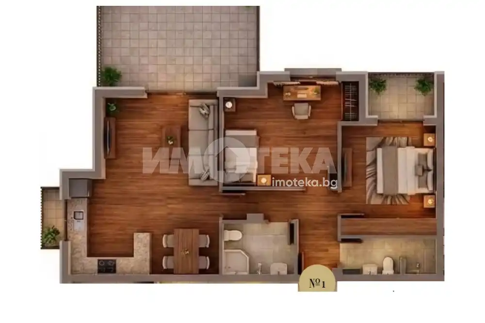 Тристаен апартамент със собствен двор, състоящ се от светла дневна с кухненски бокс и трапезария, две самостоятелни спални, баня с тоалетна, отделна тоалетна, килер, балкон, кориор. Прилежаща маза и подземен гараж/паркомясто. Имотът съчетава уюта на апартамент с предимствата на къща. Отлично разпределение, осигуряващо комфорт и удобство за бъдещите собственици. Предлага се на шпакловка и замазка, което дава възможност за довършване според индивидуалния вкус и предпочитания.