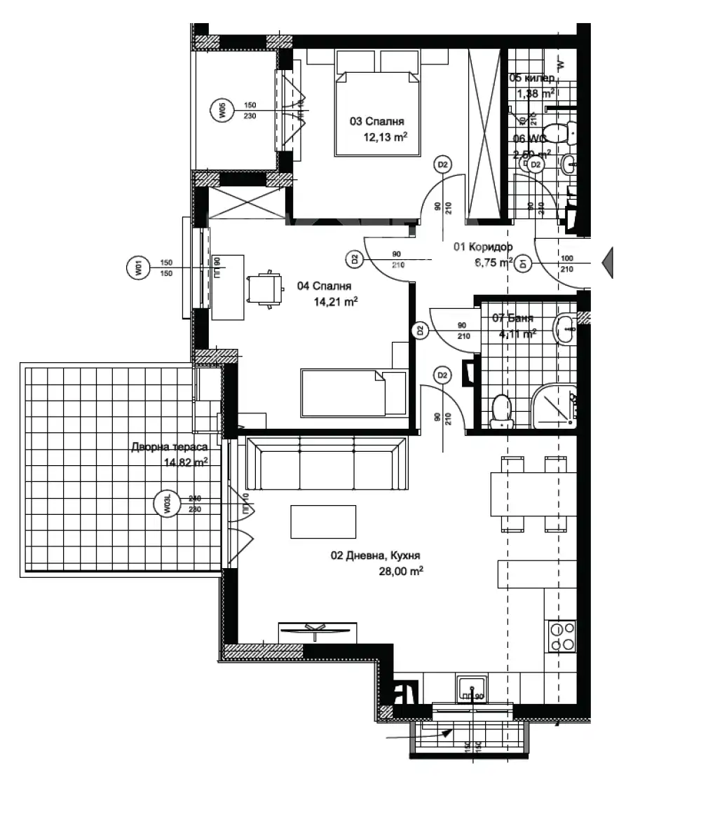 Тристаен апартамент със собствен двор, състоящ се от светла дневна с кухненски бокс и трапезария, две самостоятелни спални, баня с тоалетна, отделна тоалетна, килер, балкон, кориор. Прилежаща маза и подземен гараж/паркомясто. Имотът съчетава уюта на апартамент с предимствата на къща. Отлично разпределение, осигуряващо комфорт и удобство за бъдещите собственици. Предлага се на шпакловка и замазка, което дава възможност за довършване според индивидуалния вкус и предпочитания.