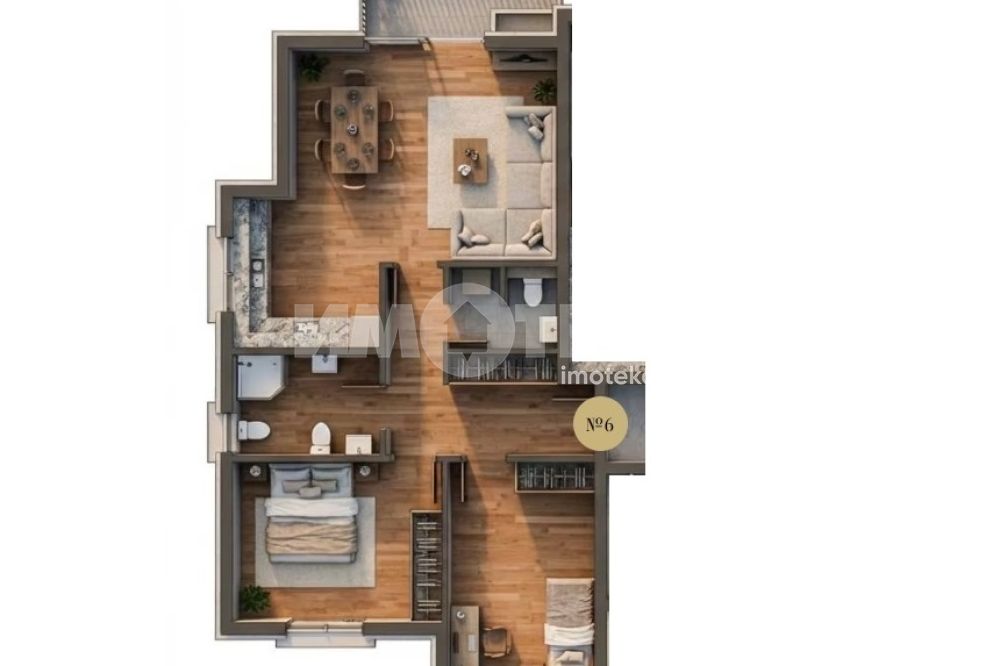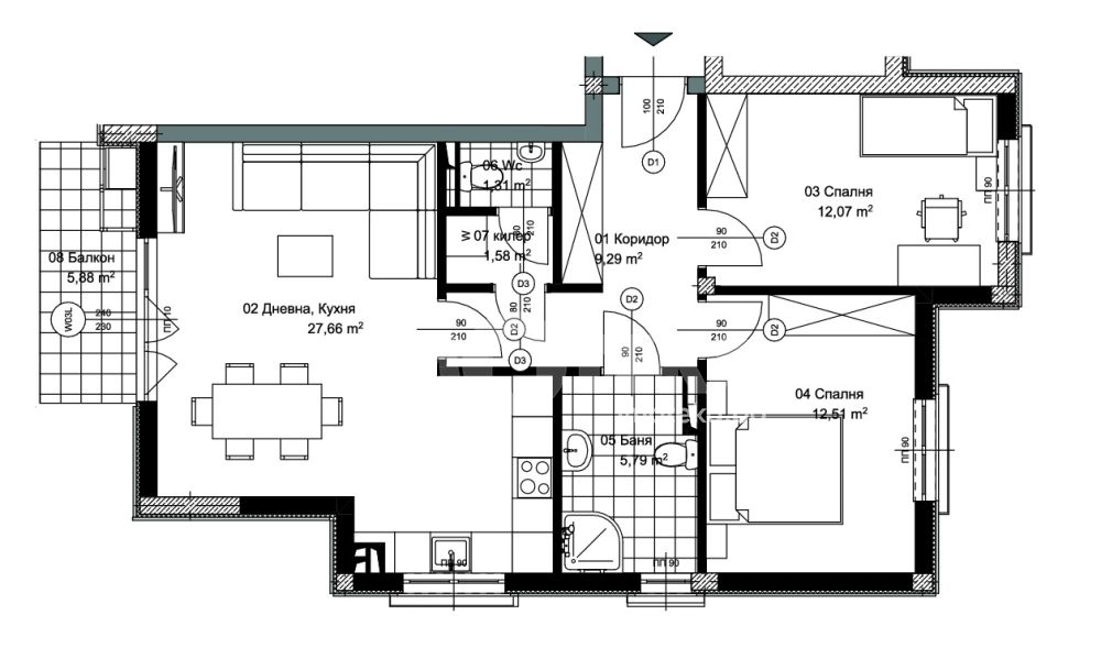 Просторен и функционален тристаен апартамент, състоящ се от светла дневна с кухненски бокс и трапезария, две самостоятелни спални, баня с тоалетна, отделна тоалетна, килер, балкон, кориор. Прилежаща маза и подземен гараж/паркомясто. Апартаментът е с правилни форми на помещенията и отлично разпределение, осигуряващо комфорт и удобство за бъдещите собственици. Предлага се на шпакловка и замазка, което дава възможност за довършване според индивидуалния вкус и предпочитания.