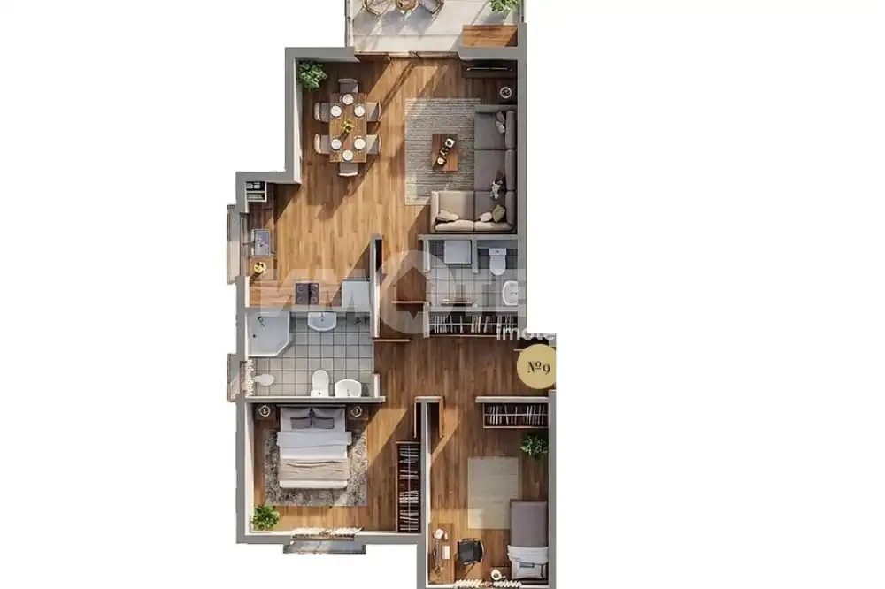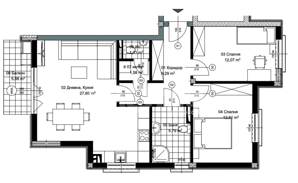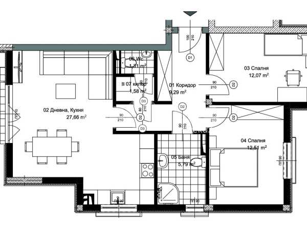 Просторен и функционален тристаен апартамент, състоящ се от светла дневна с кухненски бокс и трапезария, две самостоятелни спални, баня с тоалетна, отделна тоалетна, килер, балкон, кориор. Прилежаща маза и подземен гараж/паркомясто. Апартаментът е с правилни форми на помещенията и отлично разпределение, осигуряващо комфорт и удобство за бъдещите собственици. Предлага се на шпакловка и замазка, което дава възможност за довършване според индивидуалния вкус и предпочитания.