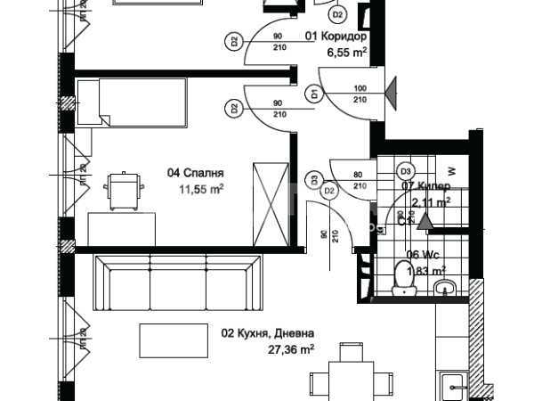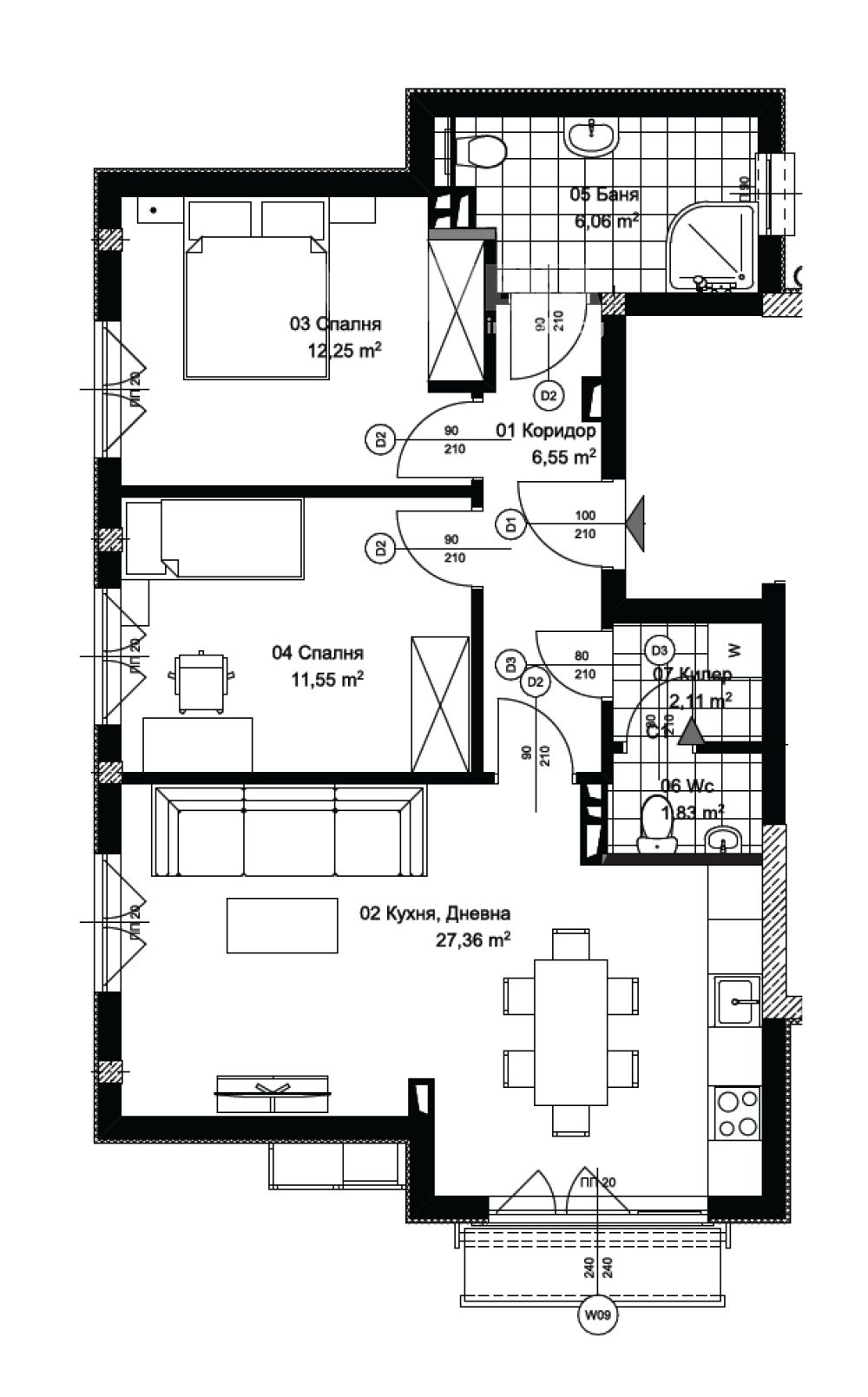 Панорамен, просторен и функционален тристаен апартамент, състоящ се от светла дневна с кухненски бокс и трапезария, две самостоятелни спални, баня с тоалетна, отделна тоалетна, килер, балкон, кориор. Прилежаща маза и подземен гараж/паркомясто. Апартаментът е с правилни форми на помещенията и отлично разпределение, осигуряващо комфорт и удобство за бъдещите собственици. Предлага се на шпакловка и замазка, което дава възможност за довършване според индивидуалния вкус и предпочитания.