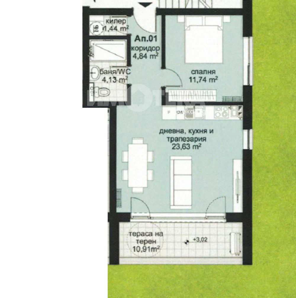 Жилището се състои от входно антре (коридор), което осигурява удобно разпределение към всички помещения. Просторната дневна с кухня и трапезария е проектирана като светло и приветливо общо пространство с възможност за обособяване на различни функционални зони. Спалнята предлага уют и спокойствие, подходящи за пълноценна почивка.