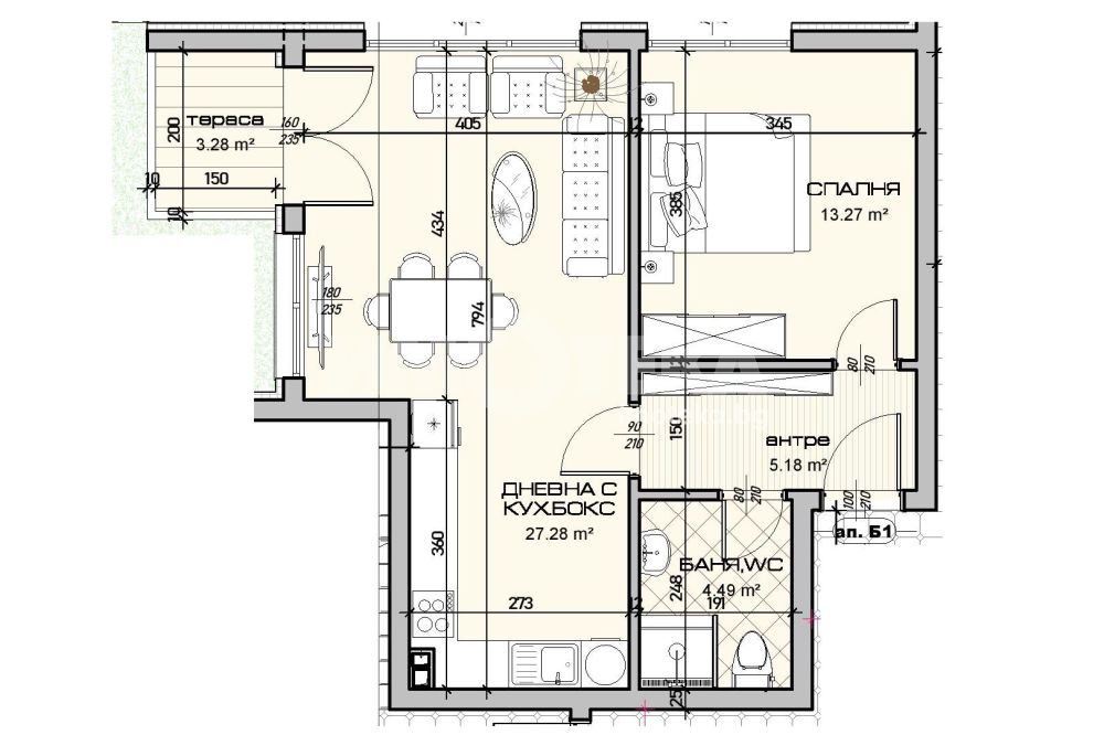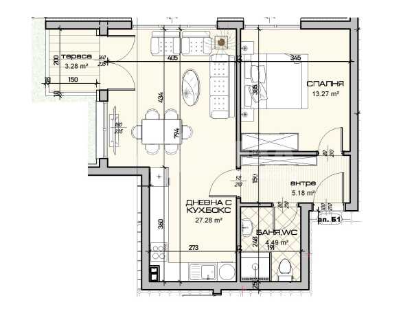 Апартаментът разполага със санитарен възел в оптимален размер, маза с добри размери за удобство и практично съхранение.