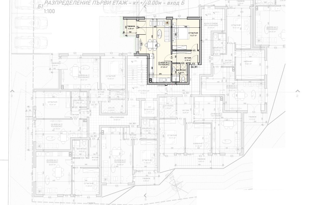 Жилището се състои от входно антре (коридор), което осигурява удобно разпределение към всички помещения. Просторната дневна с кухня и трапезария е проектирана като светло и приветливо общо пространство с възможност за обособяване на различни функционални зони. Спалнята предлага уют и спокойствие, подходящи за пълноценна почивка.
