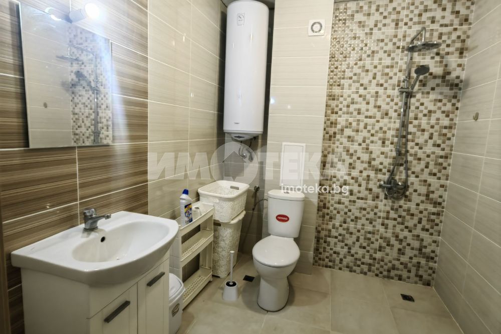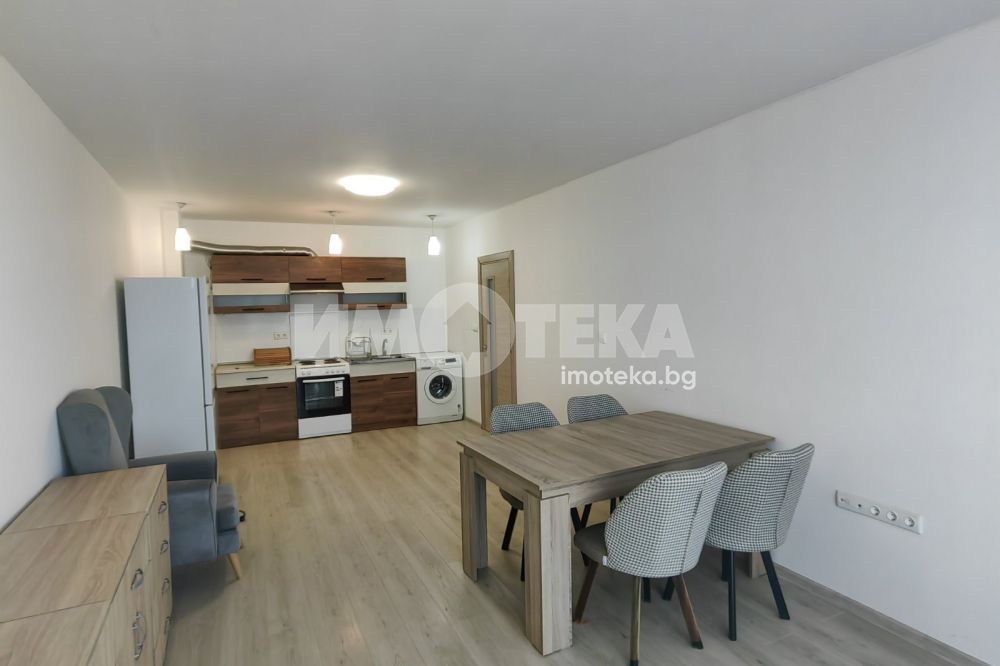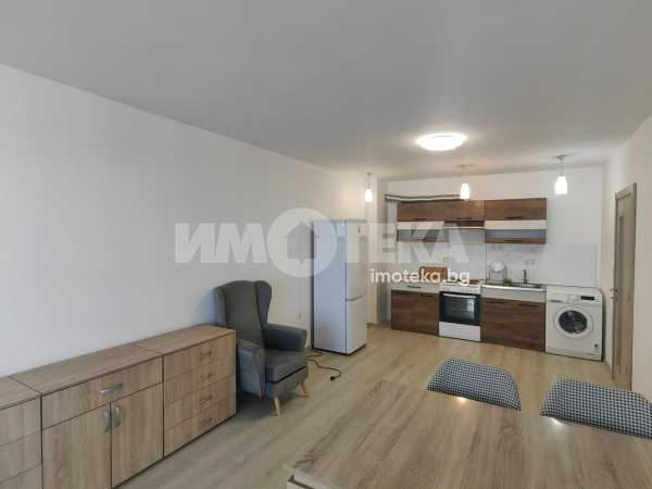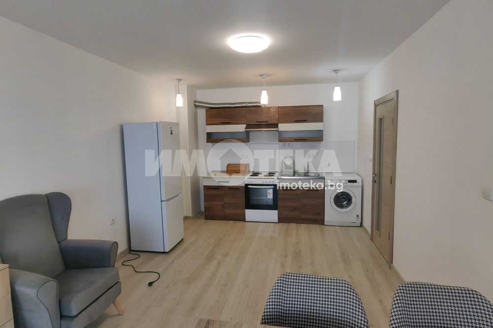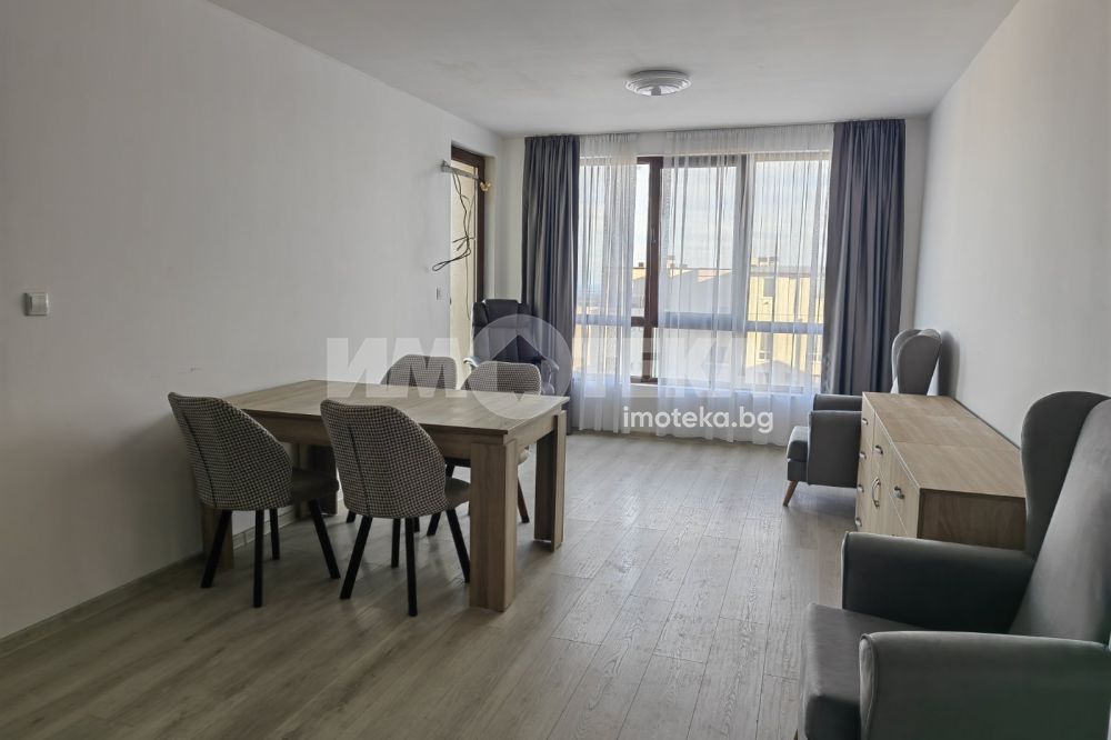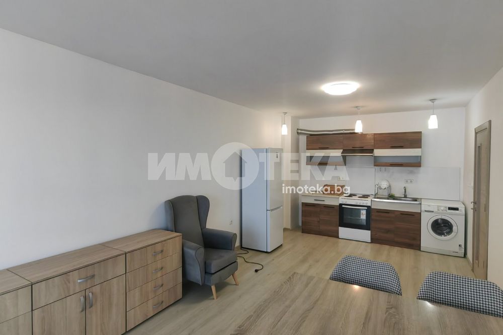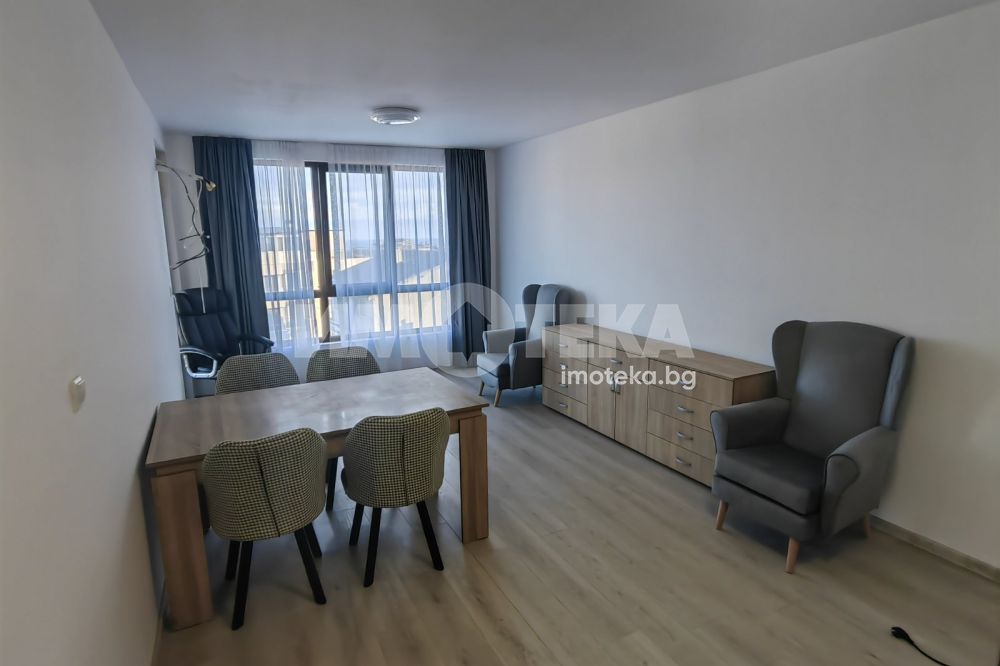 Голям двустаен, панорамен апартамент, в нова жилищна сграда с асансьор. Жилището се предлага обзаведено (втори климатик и гардероб могат да бъдат закупени при наемане).