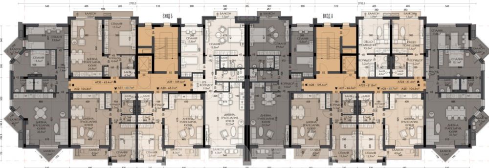 Тристаен тухлен апартамент, който се състои от коридор, просторен дневен тракт, две спални, две санитарни помещения и три тераси.
