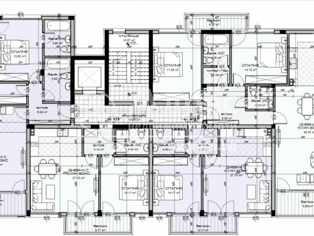 Тристаен апартамент в луксозна жилищна сграда. Дневен тракт 42,5 кв, две спални 17 и 15 кв, две бани и тоалет, две тераси. Степен на завършеност по БДС. Възможност за покупка на открити и закрити паркоместа и подземи гаражи.