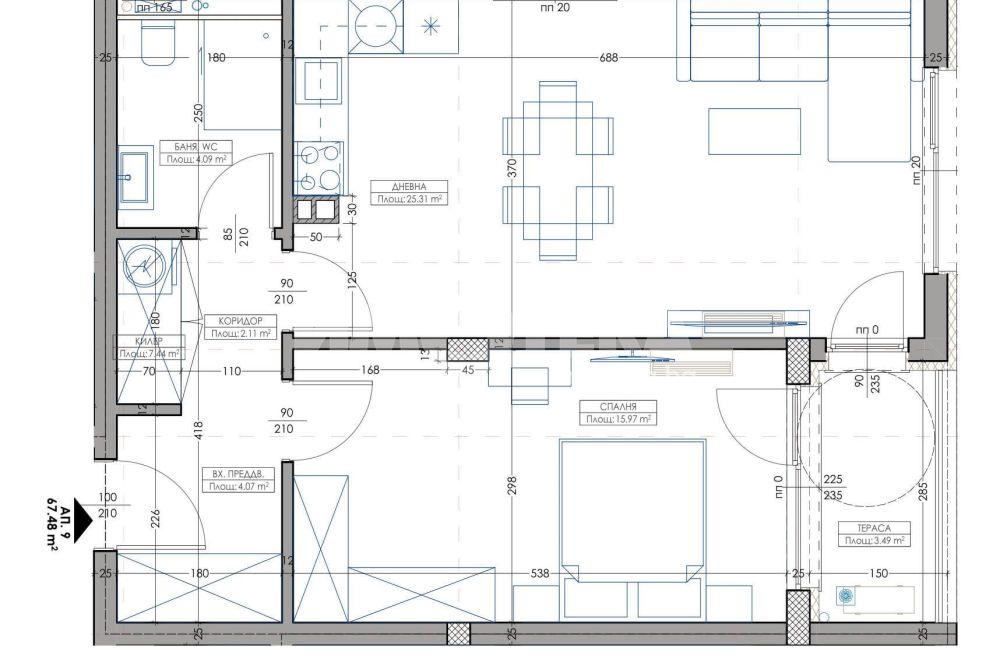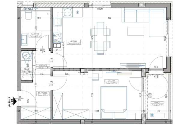 Апартамент – Дневна с кухненски бокс, спалня, баня с тоалетна, килер, коридор, входно преддверие, тераса. Имотът е с обща площ 80,81 кв.м, което включва 67,48 кв. м чиста площ и 13,33 кв.м общи части.