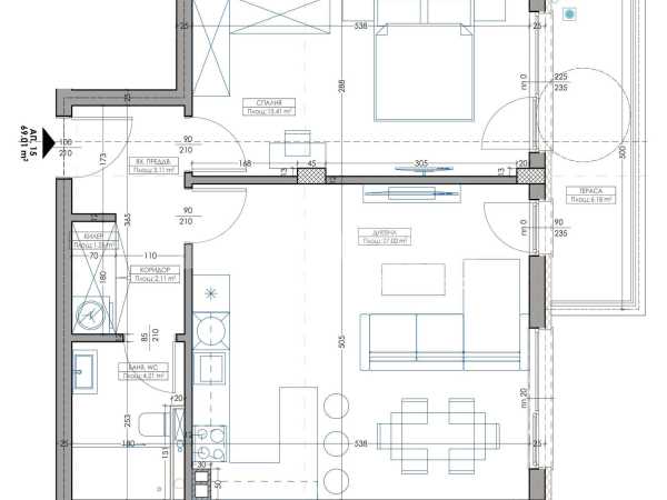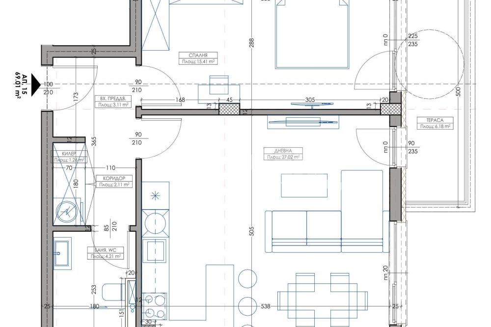 Апартамент – Дневна с кухненски бокс, спалня, баня с тоалетна, килер, входно преддверие. Имотът е с обща площ 62,33 кв.м, което включва 52,73 кв. м чиста площ и 9,60 кв.м общи части. Към апартамента е включен и двор 124,61 кв.м.