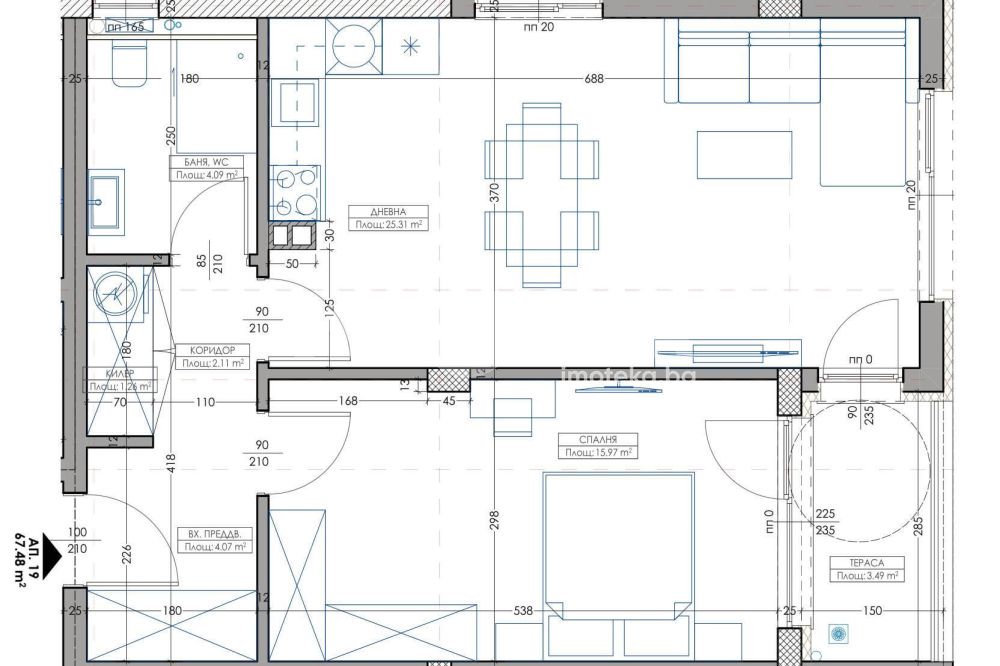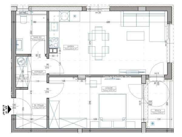 Апартамент – Дневна с кухненски бокс, спалня, баня с тоалетна, килер, входно преддверие. Имотът е с обща площ 62,33 кв.м, което включва 52,73 кв. м чиста площ и 9,60 кв.м общи части. Към апартамента е включен и двор 124,61 кв.м.