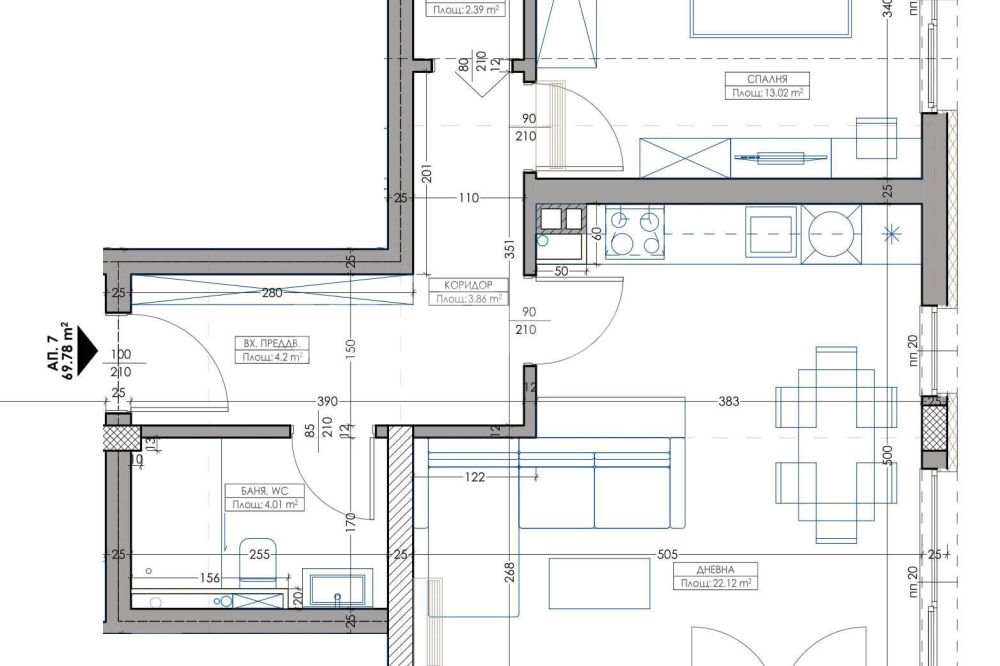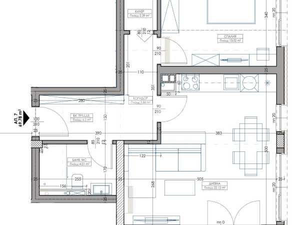 Апартамент – Дневна с кухненски бокс, спалня, баня с тоалетна, килер, входно преддверие. Имотът е с обща площ 62,33 кв.м, което включва 52,73 кв. м чиста площ и 9,60 кв.м общи части. Към апартамента е включен и двор 124,61 кв.м.