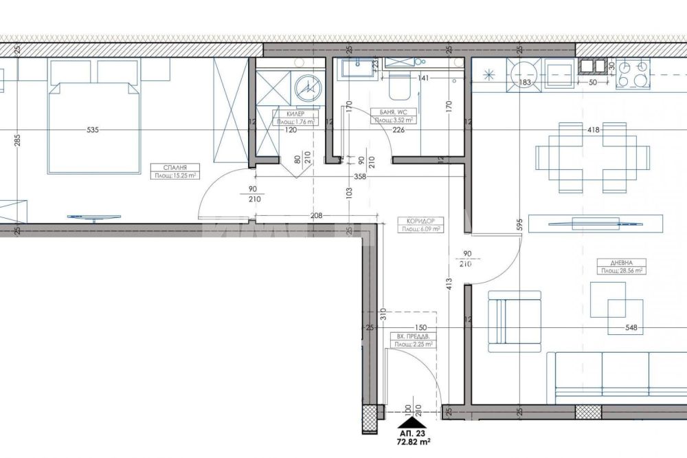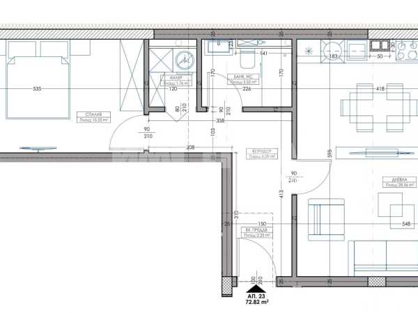 Апартамент – Дневна с кухненски бокс, спалня, баня с тоалетна, килер, входно преддверие. Имотът е с обща площ 62,33 кв.м, което включва 52,73 кв. м чиста площ и 9,60 кв.м общи части. Към апартамента е включен и двор 124,61 кв.м.