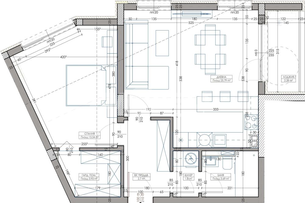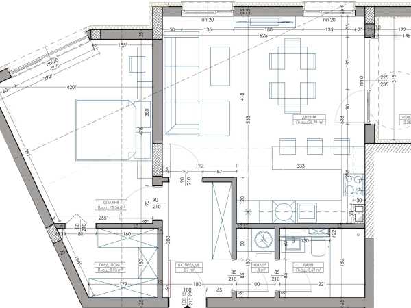 Апартамент – Дневна с кухненски бокс, спалня, баня с тоалетна, гардеробно помещение, килер, входно преддверие, лоджия. Имотът е с обща площ 85,6 кв.м, което включва 72,28 кв. м чиста площ и 13,32 кв.м общи части.