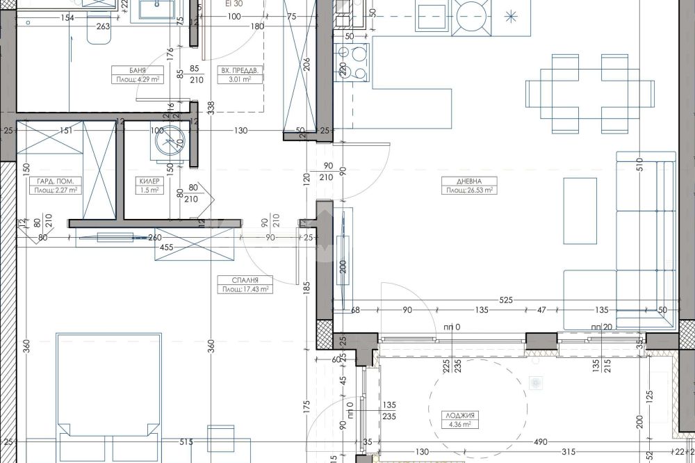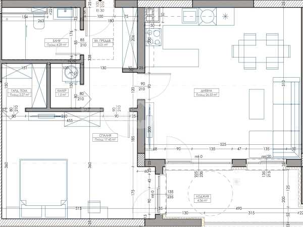 Апартамент – Дневна с кухненски бокс, спалня, баня с тоалетна, гардеробно помещение, килер, входно преддверие, лоджия. Имотът е с обща площ 90,75 кв.м, което включва 76,63 кв. м чиста площ и 14,12 кв.м общи части.