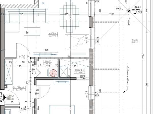 Апартамент – Дневна с кухненски бокс, спалня, баня с тоалетна, килер, коридор, балкон. Имотът е с обща площ 87,39 кв.м, което включва 74 кв. м чиста площ и 13,39 кв.м общи части.