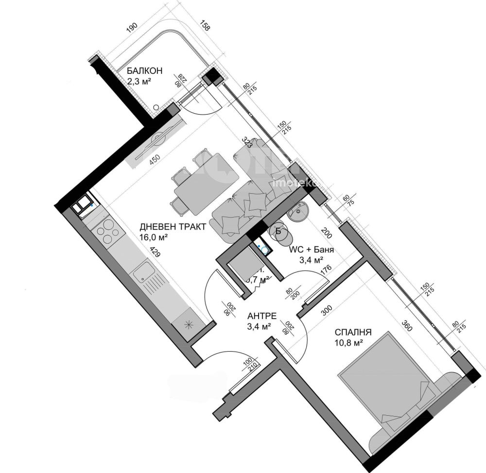 Двустаен апартамент състоящ се от: коридор, дневна с кухненски бокс, спалня, комбиниран санитарен възел и тераса!