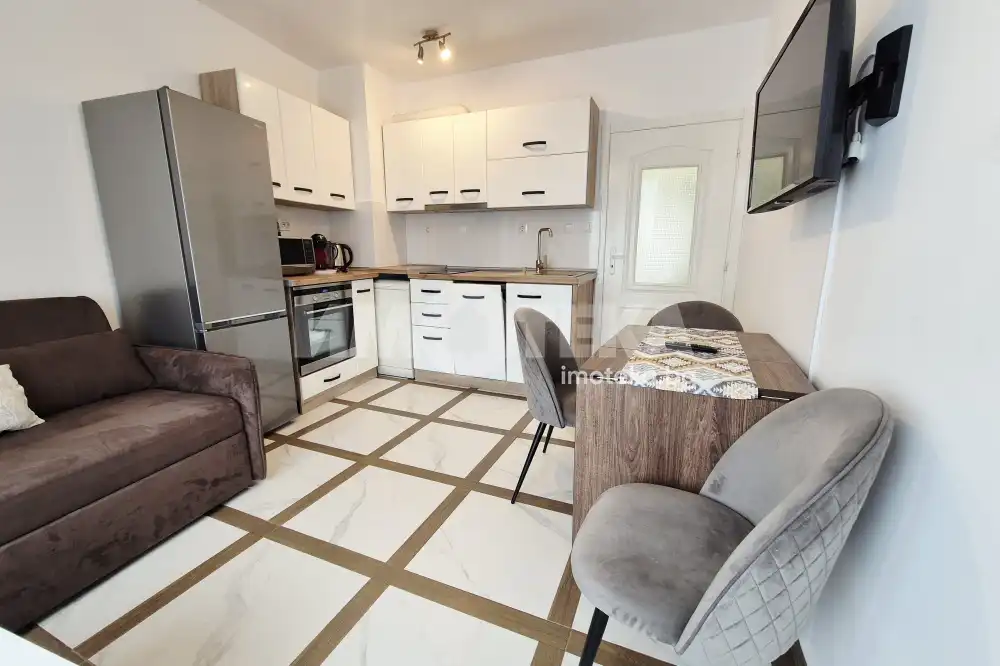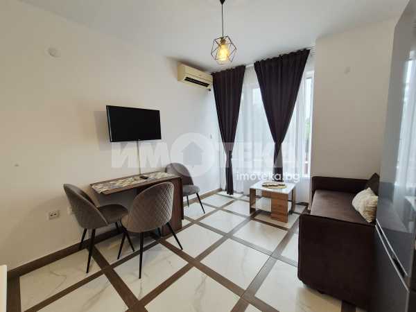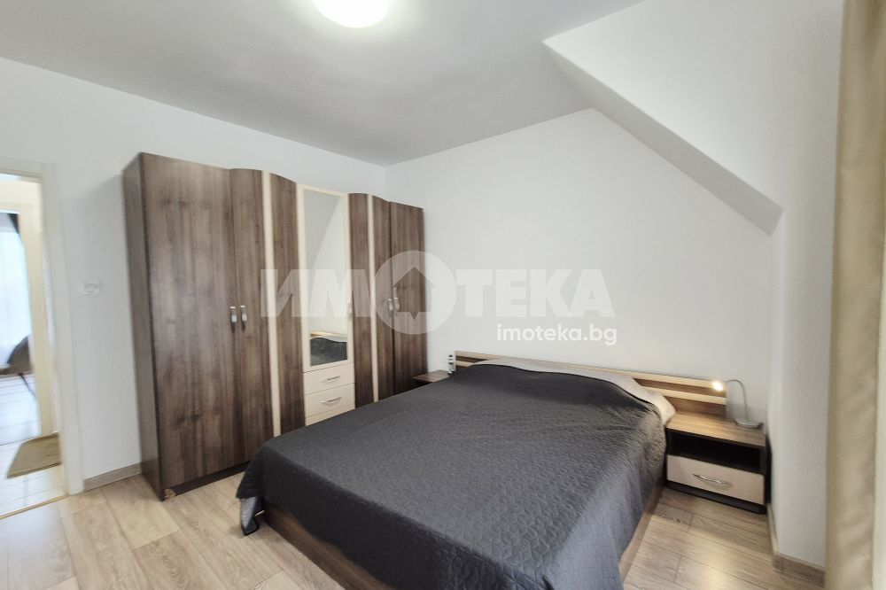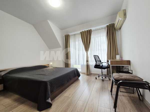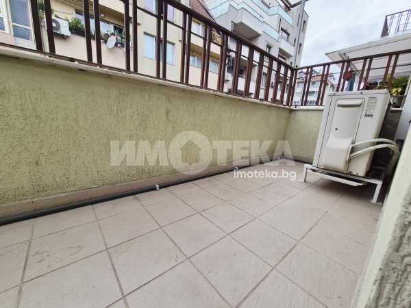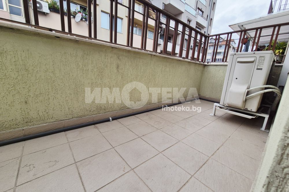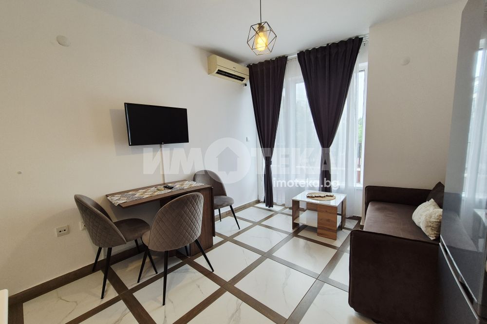 Двустаен, обзаведен апартамент в широк център. Състои се от кокетна дневна с кухненска част - бяла техника вкл. съдомиялна, мека мебел, малка тераса. Спалня - напълно обзаведена, просторна тераса. Баня с тоалет.