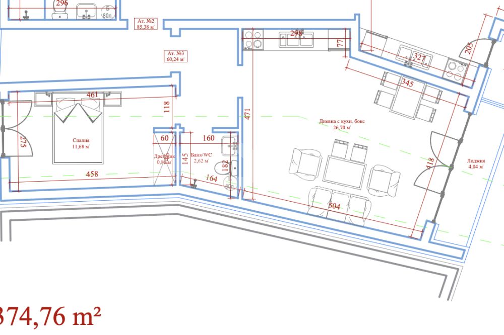 Двустаен апартамент със следното разпределение: дневна с кухненски бокс, спалня, баня с тоалетна, лоджия и антре.