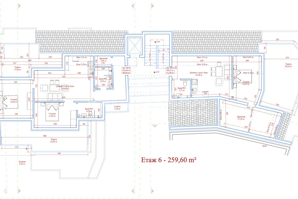 Етажност: 6 надземни етажа + 2 подземни нива (паркинг).