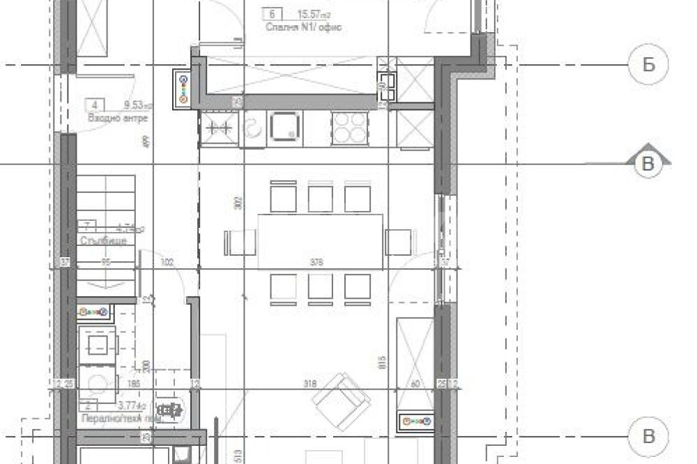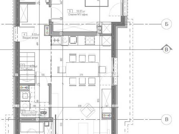 1ви етаж - 80.56кв.м -входно антре, просторна дневна стая с бокс кухня с площ, кабинет, домакинско помещение, дрешник, санитарен възел, баня с WC