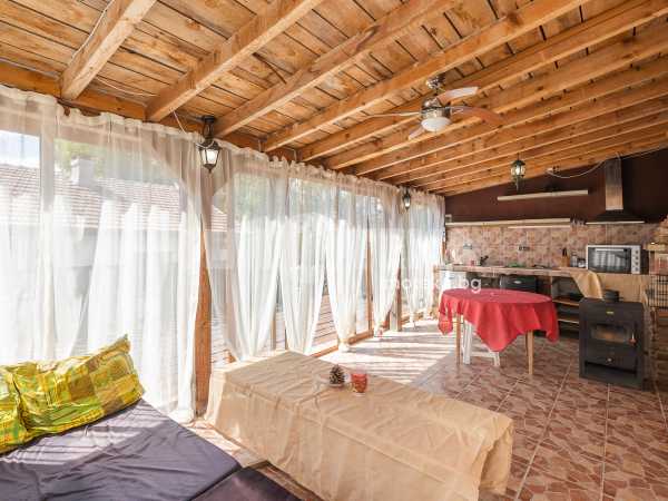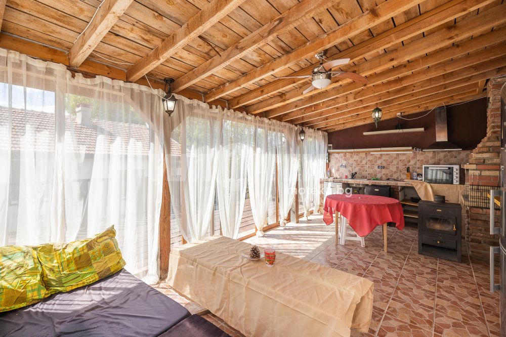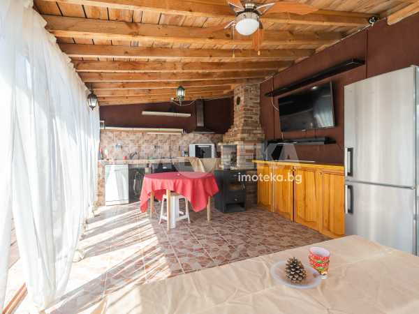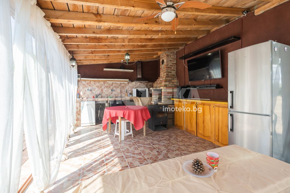 Закрита с френски прозорци барбекю зона с кухненска част и трапезария.